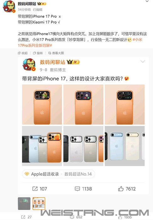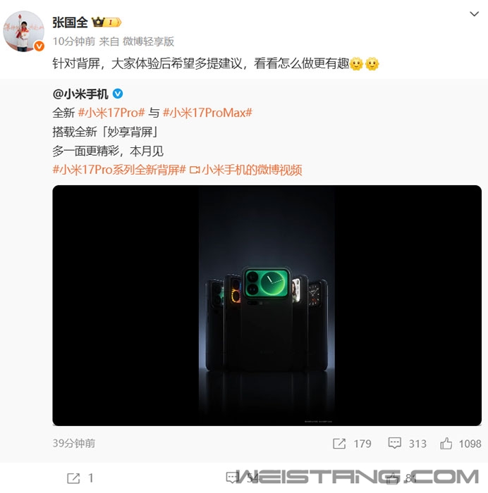 如此前爆料,今天上午,小米手机官微如约公布了小米17 Pro与小米17 Pro Max的外观细节,比iPhone 17系列多了一块屏—— 全新的“妙享背屏”,按照卢伟冰的话说,就是想给手机行业带来点“新东西”。 从官方公布的视频来看,小米17 Pro系列的这块“妙享背屏”支持时钟主题、拍照显示、小米汽车App控制等多种功能,预计在“人车家”交互上也将带来更多玩法。 小米手机系统软件部总监张国全也在微博上向网友征求意见:“针对背屏,大家体验后希望多提建议,看看怎么做更有趣”。 这不仅次小米数字系列第一次命名全面对标iPhone,也是产品上同代同级地直面iPhone。 知名爆料博主@数码闲聊站 表示,之前就觉得iPhone17横向大矩阵有点突兀,加上背屏顺眼多了,可惜苹果没有这么激进,小米17 Pro系列首发“妙享背屏”,行业独一无二的新设计。 据悉,小米17系列,包括三款产品:小米17、小米17 Pro、小米17 Pro Max。 它们将全球首发第五代骁龙 8 至尊版移动平台。 小米 17,是史上最强标准版旗舰,全方位大升级,加量不加价。 小米 17 Pro,小米最精湛的小尺寸科技影像旗舰; 小米 17 Pro Max,更是小米史上最强大的巅峰科技影像旗舰。 新机将于本月正式发布 |