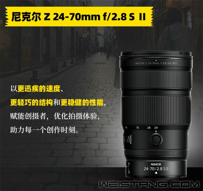 尼康尼克尔Z 24-70mm f/2.8 S Ⅱ今天正式开售,定价16999元。 新款镜头采用平滑高速音圈马达(SSVCM)驱动,自动对焦速度为前代产品的约5倍,对焦追踪性能提升约60%。 无论24mm广角端抓拍风光,还是70mm端定格人像,都能快速锁定目标。 搭配Z6 II、Z7 II等机型的高速连拍,婚礼跟拍、车展抓拍等动态场景的出片率显著提升。 光学素质延续旗舰水准,11片光圈叶片呈现自然圆润的虚化效果,低色散(ED)镜片与非球面镜片合理搭配实现锐利清晰的成像。 值得一提的是,尼康尼克尔Z 24-70mm f/2.8 S Ⅱ重量仅约675g,在同级别镜头中更为轻巧。 |