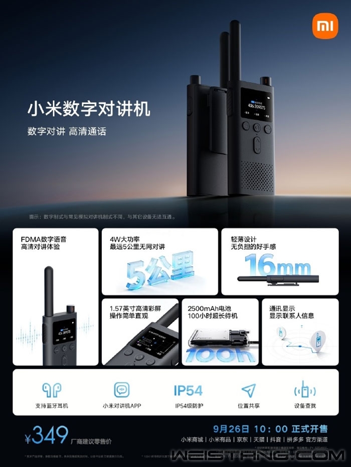 今日,小米数字对讲机发布,售价349元,这是国内首款共用对讲机,拥有大功率的同时,无需申请取得无线电频率使用许可。 小米数字对讲机采用FDMA数字制式,内置64组色码,大幅减少串频干扰。 该对讲机最大4W发射功率,支持最远5公里无网对讲,其中,户外范围1-5公里、高速范围0.5-3公里、城市范围0.5-2公里,商场覆盖10000平方米。 得益于数字制式,对讲时可传输显示联系人信息,不再只靠听声辨人,搭配小米对讲机App,对讲时还能显示对方相对方位。 续航上,小米数字对讲机内置2500mAh电池,宣称“100小时超长待机,连续使用14小时。”,配备Type-C充电接口。 小米数字对讲机内置36毫米大口径扬声器,配有1.57英寸彩屏,分辨率为320*200,支持连接Type-C有线耳机、蓝牙耳机使用。 其他方面,该对讲机支持IP54级防护、双频模式、隔空拷频、快速对频,重约137克。 可通过小米对讲机App共享位置、设备查找、App写频、设定单呼、组呼、全呼等对讲方式。 |