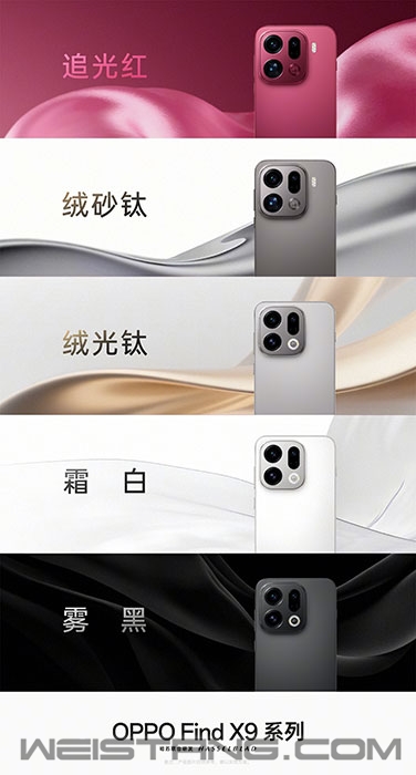 OPPO Find X9系列此前已经官宣,将于10月16日19:00正式发布,共OPPO Find X9、OPPO Find X9 Pro两款机型。 今天上午,OPPO Find X9系列的全配色正式公布,共有五款配色:追光红、绒砂钛、绒光钛、霜白、雾黑。 其中,OPPO Find X9有绒光钛、霜白、雾黑、追光红四款配色,OPPO Find X9 Pro则是绒砂钛、追光红、霜白三款。 全系搭载哈苏四摄影像系统,后摄造型与OPPO Reno14类似,但明显更加强大,而且在面积、凸起都极度克制的轻巧方形镜组下,带来进光量的巨大提升。 值得一提的是,OPPO Find X9全系直屏,延续Find X8系列6.59英寸、6.78英寸的黄金握持尺寸。 采用超大弧度边框设计,可消除握持时边框带来的“硌手感”,上手更圆润服帖。 核心搭载联发科天玑9500,此前官方晒出的跑分已经突破400万。 在影像与散热能力大幅升级的前提下,全系配备7000+mAh超大电量冰川电池,标准版拥有同档最强7025mAh电池,Pro版为7500mAh。 OPPO Find系列产品负责人周意保此前发文强调:“让用户能在一款旗舰里轻薄、影像、续航三者兼得,只有我们做到。” |