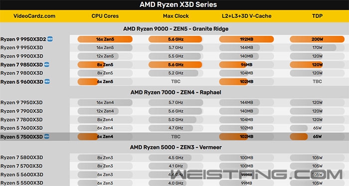 AMD X3D家族日渐丰富,不仅Zen5家族有新品,Zen4同样不甘落后。 根据确凿情报,AMD正准备推出入门款的锐龙5 7500X3D。 同时,已经有英国零售商摆上了预售货架,甚至公布了完整的OPN编号“100-000001904”,但没有透露任何具体规格。 不出意外的话,它应该和锐龙5 7600X3D一样都是6核心12线程、102MB大缓存,包括6MB三级缓存、32MB三级缓存、64MB 3D缓存,预计热设计功耗还是65W。 至于频率,肯定要低于4.7GHz。 不想要老架构的,还可以等待锐龙5 9600X3D,同样是6核心、102MB缓存,热设计功耗应该也是65W。 问题在于,它们可能不会大量供应零售市场,而是主供OEM市场。 当然,更令人期待的是锐龙9950 X3D2、锐龙7 9850X3D。 前者首次双CCD同时堆叠3D缓存,总计208MB,主频依然有5.6GHz。 后者是锐龙7 9800X3D的升级版,加速频率提高400MHz而达到5.6GHz。 以上产品的发布时间都不清楚,大概率会在CES 2026。 |