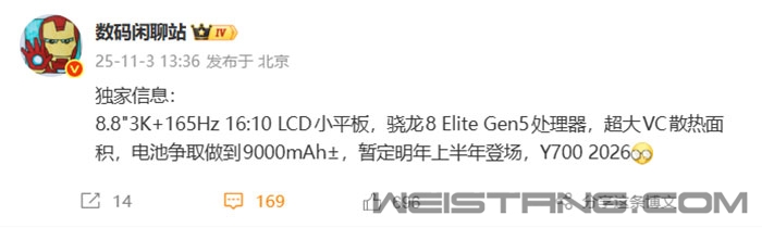 今日,数码博主“数码闲聊站”曝光联想拯救者Y700 2026款平板部分核心规格,新品预计2026年上半年发布。 据了解,新款Y700将搭载第五代骁龙8至尊版旗舰芯片,依然是一款主打性能的小尺寸平板。 正面是一块3K分辨率8.8英寸LCD屏,支持165Hz刷新率、16:10屏幕比例更适合游戏和视频,配有超大面积的VC均热板。 该博主还提到,全新Y700电池容量目标要做到9000mAh左右。 作为参考,今年5月推出的联想拯救者平板Y700四代售价3299元起,搭载骁龙8至尊版处理器,采用8.8英寸LCD华星屏,3040*1904分辨率、支持165Hz刷新率,内置12000mm? VC均热板,散热总面积达41356mm?。 续航上,该机内置7600mAh电池,支持68W快充。 联想拯救者平板Y700四代 |