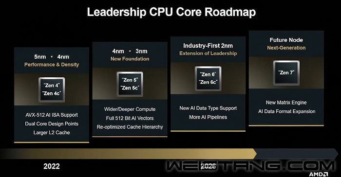 新一届分析师大会上,AMD如约公布了未来CPU架构路线图,透露了Zen6的一些关键消息,第一次公开确认了Zen7。 不过注意,这次路线图对应的产品,其实都是数据中心级EPYC,不涉及消费级锐龙,二者在工艺、技术上有很大不同。 Zen4时代首次划分出了Zen4、Zen4c两种核心(不同于Intel的异构大小核),分别采用5nm、4nm工艺,首次支持AVX-512指令集,增大了二级缓存。 Zen5、Zen5c分别升级为4nm、3nm,支持完整512位路径的AVX-512,加宽加深了计算引擎,还重新优化了缓存体系的一致性。 接下来就是Zen6、Zen6c两兄弟,全球首次采用2nm先进工艺,但是暂不完全确定两种核心是否均为2nm,不排除Zen6 3nm、Zen6c 2nm的可能性。 Zen6系列的EPYC将支持新的AI数据类型,加入更多的AI流水线,这都在意料之中,详情未公开。 Zen6的发布时间就在明年,当然还是EPYC先行,锐龙大概率要等2027年。 再往后的Zen7,没有透露具体工艺,只是标注“未来节点”(Future Node),有可能升级为14A,台积电的工厂即将开工。 Zen7的升级重点还是AI,比如加入新的矩阵引擎,继续拓展AI数据格式。 至于是否继续划分为Zen7、Zen7c,至少这份路线图没有明确。 |