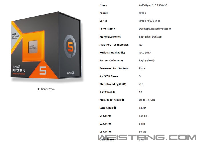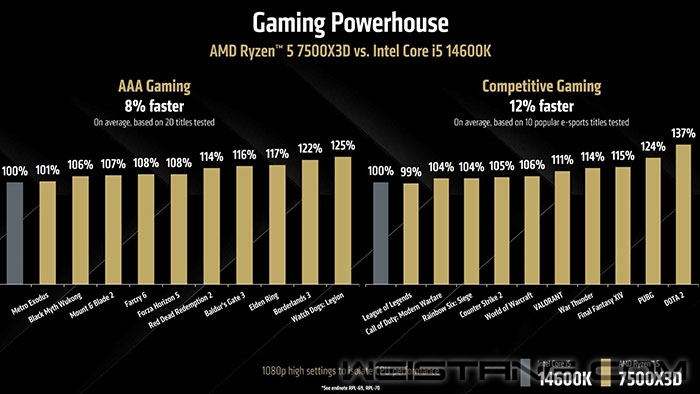 AMD正式发布了其Zen 4架构新成员锐龙5 7500X3D,这款6核/12线程的处理器进一步扩展了其X3D芯片阵容,目标直指入门级游戏市场。 锐龙5 7500X3D采用了3D V-Cache技术,拥有32+64MB的L3缓存,基础频率为4.0GHz,最高可提升至4.5GHz,TDP为65W,集成基于RDNA 2架构的图形核心,具备两颗GPU核心,频率达到2200MHz。 从参数上来看,7500X3D与同系列的锐龙7600X3D十分相似,只是频率由4.1GHz/4.7GHz降至4.5GHz/4GHz。 同时AMD还公布了其性能数据,显示在游戏性能上明显快于Intel的i5-14600K和最新的酷睿Ultra 5 245KF处理器: 对比酷睿Ultra 5 245KF:在3A游戏中平均快13%,在竞技游戏中平均快22%。 对比i5-14600K:在3A游戏中领先8%,在竞技游戏中领先12%。 虽然这些数据来自AMD,但理论上7500X3D的游戏性能应接近7600X3D,后者已证实快于上述两款Intel处理器,甚至AMD自家Zen 5架构的9600X。 价格方面,锐龙5 7500X3D的官方定价为269美元,折合人民币约1913元,高于此前市场预期的200美元左右,目前这款处理器仅在北美(North America)和 EMEA(欧洲、中东和非洲)地区上市。 |