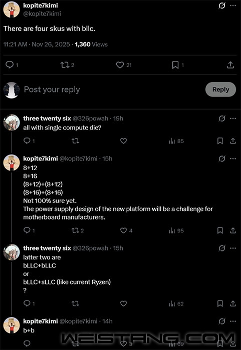 随着AMD大缓存的X3D处理器在游戏性能上取得巨大成功,Intel显然正准备在其下一代Nova Lake-S桌面CPU上采取策略进行反击。 最新消息指出,Nova Lake-S系列中至少将有四款型号会配备bLLC(Big Last-Level Cache,大型末级缓存)的配置。 Kopite7kimi指出,这些拥有超大缓存的Nova Lake-S CPU都将是“不锁频”的设计,旨在提供最佳性能和超频潜力,分别是: 2x 8+16 (48核 + 4 LPE核) + 288MB bLLC 2x 8+12 (40核 + 4 LPE核) + 288MB bLLC 8+16 (24核 + 4 LPE核) + 144MB bLLC 8+12 (20核 + 4 LPE核) + 144MB bLLC 其中双Compute Tile型号包含两个8P+16E核心Tile,提供48个核心,加上额外的4个低功耗(LPE)核心,总核心数达到52个。每个Compute Tile将配备144MB的bLLC缓存,使得总缓存容量高达288MB。 除了52核版本旗舰,双Tile系列还将包括一个基于两个8P+12E Tile的40核版本(总计44核),预计也将配备288MB的bLLC缓存。 单Compute Tile型号则分别为8P+16E(总计28核)和8P+12E(总计24核)配置,均将配备144MB的bLLC缓存,通常情况下,Intel可能会率先推出这些单Tile版本。 Kopite7kimi还表示,超大缓存的引入将对主板商构成挑战,他们需要在下一代LGA 1954接口的主板上设计出更先进的供电方案,以满足这些高性能、高缓存CPU的需求。 如此庞大的缓存,显然是Intel针对AMD的双3D缓存CCD设计的回击,AMD预计将首次推出双3D V-Cache型号,首款预计为锐龙9 9950X3D2。 |