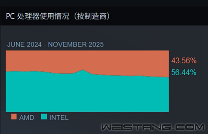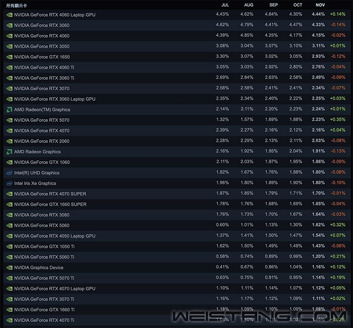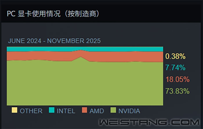 随着2025年步入尾声,Steam平台公布了最新的11月份软硬件调查数据,显示NVIDIA Blackwell架构的产品正在快速崛起。 在显卡方面,NVIDIA仍以73.83%的使用率稳居第一,AMD和Intel分别以18.05%和7.74%位居二、三位,其中AMD的使用率呈持续上升趋势。 NVIDIA最新的Blackwell GPU架构产品展现出强劲的增长势头,RTX 5070成为该架构中唯一最接近前十的显卡,使用率达到2.23%居第11,RTX 4070被挤出前十,跌至第12位。 RTX 5070与排在第10位的AMD Radeon Graphics仅有0.01%的微弱差距,整个RTX 50系列产品线在11月份增长了1.35%,在总显卡排行中占有8.83%的使用率。 而RTX 5050,以及AMD的RX 9070和RX 9060系列,在11月份的调查中依旧不见踪影;另外显卡前两名也发生变化,RTX 4060 Laptop与RTX 3060再次互换了位置。 此外,高达33.36%的玩家显卡依然是8GB显存,这可能也是Steam Machine维持8GB的主要原因。 在处理器方面,AMD继续扩大市场份额,使用率达到43.56%,而Intel则从10月份的57.11%微幅下滑至56.44%。 6核心依旧是玩家最主要的配置,但其使用率呈下滑趋势,紧随其后的是8核心和4核心,14核心首次进入了使用率超过5%的名单。 内存方面,16GB仍是最多玩家采用的容量,占有40.94%的比例,而32GB配置紧随其后,使用率为36.96%。 操作系统方面,Windows 11的使用率已攀升至65.59%,Windows 10的使用率为29.04%。 在屏幕分辨率上,1920 x 1080仍然是绝对主流,拥有52.83%的使用率;2560 x 1440的使用率达到20.79%。 至于语言,英文仍占据首位(37.37%),而简体中文(24.93%)和俄文(9.88%)继续稳居第二和第三大使用语系。 |