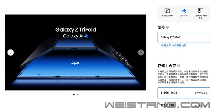 三星上周发布的首款三折叠Galaxy Z TriFold已经推出国行版本,目前在三星官网等开启预定。 国行版提供两个版本,16GB+512GB定价19999元,16GB+1TB定价21999元,仅有一款时空黑配色可选,预计12月19日开启发货。 Galaxy Z TriFold采用双侧内折的G字形折叠方案,与华为Z字形完全不同,折叠状态下屏幕可收纳于机身内部,防护性更强。 整机最薄处仅3.9mm,闭合厚度约12mm,重量309g,配备钛合金铰链盖与装甲铝中框,通过IP48级防尘防水认证。 折叠状态下的外屏是6.5英寸,表面覆盖康宁大猩猩陶瓷玻璃2,支持1-120Hz自适应刷新率,峰值亮度达2600尼特。 完全展开后是一块10英寸超大屏,分辨率2160×1584,支持120Hz刷新率与1600尼特峰值亮度,可实现平板级大屏生产力体验。 核心高通骁龙8至尊版移动平台,内置5600mAh电池,支持45W快充(30分钟充至50%)。 预装基于Android 16的One UI 8,深度集成Galaxy AI功能套件,涵盖生成式编辑、照片助手等智能工具。 首次支持独立版Samsung DeX,无需外接显示器即可开启桌面级办公环境,配合鼠标和键盘可以随时随地办公。 背部配备三摄模组,分别是2亿像素广角主摄(ISOCELL HP2)、1200万像素超广角+1000万像素长焦,内外屏各配1000万像素的挖孔前置镜头。 值得注意的是,国行版本还新增了天通卫星通信功能,可以实现无网络无信号时,直连卫星通话。 该机此前已于12月2日在韩国首发,当地起售价约合17305元人民币,较国行版本低2000余元。 |