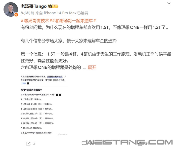 理想汽车产品线负责人汤靖@老汤哥Tango发文称,有粉丝问他,为什么现在的增程车都喜欢用1.5T,不像理想ONE一样用1.2T了?他在此给大家分享几个信息,便于大家来理解车企的选择。 一、1.5T 一般是4缸,4缸机由于天生的工作原理,发动机工作时候平衡性更好,噪音性能会更好。 之前理想ONE的增程器是外购的1.2T东安动力的三缸机,当时解决NVH问题,我们可是用上了洪荒之力,把几乎所有的手段都用上了,结果也只是做到了还OK的状态,但付出的代价实在太大了。 所以从L系列开始,我们达成共识,必须四缸机走起,这辈子我们再也不玩三缸了。 二、为什么是1.5T而不是 1.2T呢?因为现在L系列,比如L9是比原来理想ONE要大要重的,它需要的发电量要大,我理解1.2T应该是不够用了,除非技术有进步。 三、消费税问题: 国内车辆的消费税税率按排量划分,1.0-1.5L 3%;1.5-2.0L 5%;2.0-2.5L 9%;4.0L以上 40%,排量大也意味着交税多,自然车价贵。 而增程车理论上增程器发电机只要发出足够的电量,保证行车状态下电量平衡就行。 排量够用下,就尽量不要超限值, 过了这个“门槛”就意味着用户得多花不少钱,(一个40大几万的车 用户得多花大几千,可能近万的税款了。) 所以,1.5T的增程器因为是四缸,发的电量也足够,体积不大,也便于横向布置,从而节省整车X向的空间, 而且用户间接交的消费税相对最少,从而获得了行业最广泛的应用。 |