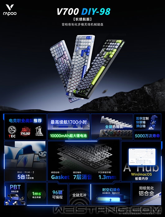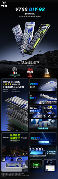 告别续航焦虑,机械键盘体验全方位进化。雷柏V700DIY-98长续航版客制化多模无线机械键盘,以单次满电可连续使用1700小时为核心突破,融合7层消音Gasket结构带来的纯净HIFI按键声效,提供两种疾速触发机械轴体,支持三模多设备连接,为游戏玩家与办公用户提供持久、干净无杂音、多设备协同的无线客制化解决方案。 · 超长续航:10000mAh大容量电池,单次充电可使用约1700小时 · HIFI手感:7层消音填充+Gasket结构,双层Poron棉,有效减少空腔音,提供一致HIFI音效 · 多设备连接:蓝牙5.0、2.4G无线、有线三模连接,支持5台设备切换 · 高度客制化:全键热插拔、5000次轴座兼容更多轴体、A hub自研驱动生态,紧凑布局保留独立方向键与数字区,兼顾空间效率与实用功能。 单次满电连用1700小时,剩余电量可视化 一次充电,玩够半年,告别几天一充时代,这不仅是技术堆砌,更是对用户真实痛点的回应。V700DIY-98长续航版内置10000mAh大容量锂电池,搭配雷柏新升级低功耗无线技术,让续航得到跨越式提升,使用USB-C接口单次充满电最长可连续使用1700小时,从此续航无忧。 作为一款合格的长续航版机械键盘,还需要必备“提醒”技能,键盘右上角的“时空幻境仓”设计,不仅仅是接收器收纳仓,也是多功能装饰灯,具备可视化用电量提醒功能,随着灯光的变化,我们可以清楚判断当前的用电量情况,电量管理一目了然,摆脱电量焦虑。 柔韧Gasket结构,不同手感轴体选择 以交付一套成熟且高品质的手感与听觉体验的机械键盘为核心出发点,让V700DIY-98长续航版既有HIFI手感,又能满足玩家的客制化心性。键盘内部结构采用了柔韧Gasket结构,七层填充消音止震,让敲击声能有更一致的声音反馈。双层PO棉堆料设计,有效减少空腔音。单键1.3mm开槽的PCB板,平衡了软弹性和稳定性,横向开槽PC定位版有效吸收振动,减少按键下凹时的偏移,提升周边键位的稳定性。同时,支持全键热插拔,5000次轴座,5脚轴座兼容市面上多种轴体,支持免焊接自由更换,满足深度客制化需求。 在手感上细分人群,针对不同人群,为玩家推出了两种手感轴体选择。面向高敏玩家,提供了约35g触发力度,1.2±0.4mm触发行程的凯华定制快银轴;针对想要兼顾游戏与打字场景的玩家,提供了约40g触发力度,1.5±0.5mm触发行程的凯华定制弹白轴。并且在轴体的围栏轴心结构上加固稳定,提升强劲回弹,疾速触发的线性手感,带来极致顺滑的体验。键帽材质上则采用含量更高的PBT双色注塑键帽,以及三款配色选择:初号骑士版、莫奈仙踪版、幻影机甲版。不仅色彩鲜艳,经久耐用,使用感上亦更舒适。 三模连接闪切设备,全自研A Hub电竞生态 快捷、高效是一款机械键盘必须具备的基本技能,V700DIY-98长续航版支持蓝牙5.0、无线2.4GHz和有线三种模式连接,轻拨模式切换键,可轻松运转最多5台设备,有线连接时还支持边用边充。 基于雷柏电竞生态,硬件性能与软件生态深度融合,将单一设备升级为生态共联协同的战略。V700DIY-98长续航版上线全自研驱动A Hub,兼容Windows/macOS双平台,配置模式跟随应用自动切换,针对不同软件可设置不同配置文件,智能识别自动切换,操作更简单便捷。 全键无冲突设计,96键可编程(有线+2.4G模式),Win系统12种多媒体快捷功能,优选功能满足多元游戏、办公诉求。多种幻彩RGB按键背光设置,预设19种背光模式,8组驱动自定义背光模式。驱动不仅支持以 1% 的精细步进调节亮度,更能对光效速度进行无级滑动调节,赋予用户从细微调整到大幅改动的全面控制权,精准匹配用户的个性偏好与使用场景。 雷柏V700DIY-98长续航版客制化多模无线机械键盘以1700小时极致续航解决无线设备根本痛点,通过7层消音Gasket结构提供纯净HIFI打字体验,配合三模多设备连接能力与全面客制化支持,重新定义了高性能无线机械键盘的标准,是追求持久续航、纯净生硬与多平台协作用户的理想选择。 |