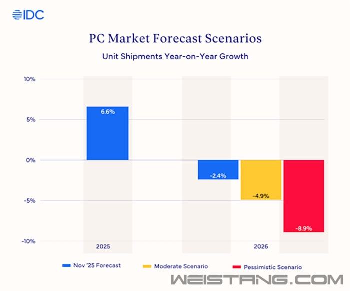 权威市调机构IDC在最新的一份报告中,预测了2026年度的PC市场,强调受内存供应短缺、价格飙升的影响,存在极大不确定性,但整体不容乐观。 因此,IDC给出了三种不同的预测,最好的情况下PC市场将在2026年萎缩2.4%,中性情境下倒退4.9%,最悲观的可能会锐减8.9%。 同时出现的则是采购成本和销售价格的上涨:中性情况平均价格涨4-6%,最差甚至要涨8%。 事实上,从目前的情况看,IDC的这个预测,还是太保守了。 联想和戴尔两大PC巨头,都已经调高了产品价格,最高幅度达15%。 定制厂商Framework已经停止了内存的单独销售,部分整机厂商甚至提供了不包含内存的配置选项。 除了内存,硬盘的价格也将在2026年持续上涨,无论机械盘还是固态盘。 简而言之,如果你是绝对刚需,不管是需要内存、硬盘还是整机,赶紧下手。 如果你的电脑还能跑两三年,就忘了这一切吧,一个字:等! |