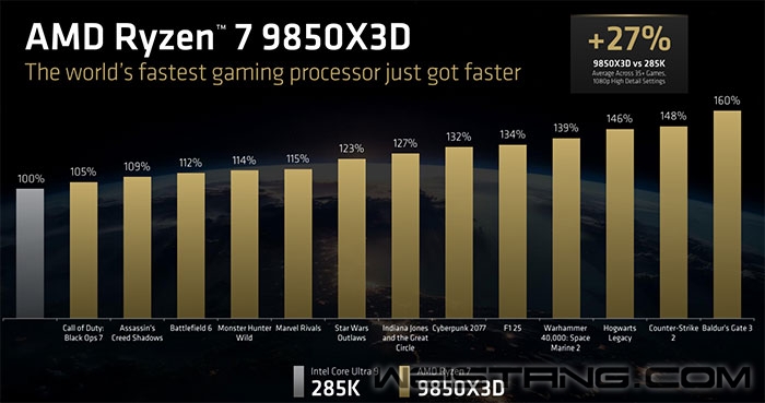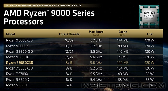 CES 2026大展上,AMD正式发布了锐龙9000系列的新成员“锐龙7 9850X3D”,也就是一代神U锐龙7 9800X3D的升级版。 锐龙7 9850X3D依然还是台积电4nm CCD、6nm IOD组成,拥有8核心16线程、8MB二级缓存、32MB原生三级缓存、64MB 3D缓存,合计104MB缓存,集成2单元GPU。 最大变化就是最高加速频率从5.2GHz飙升到5.6GHz,多了足足400MHz,而基准频率仍然维持在4.7GHz。 神奇的是,热设计功耗没变,还是120W,显然从工艺到架构都更成熟了。 价格方面应该也会在同一档次,这个要到本季度晚些时候上市的时候公布了。 至于顶级的双3D缓存,锐龙9 9950X3D2,这次没提,继续等吧。 |