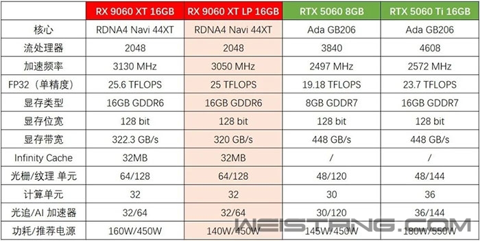 瀚铠近日正式推出了基于AMD RX 9060 XT LP(低功耗)的产品,采用双槽半高设计,整体尺寸为69×172×39mm。 AMD在去年12月低调发布了RX 9060 XT 16GB LP低功耗版本,其TDP从标准版的160W降至140W,GPU运行频率小幅下调,官方建议的电源也从500W下调至450W。 不过RX 9060 XT LP版在硬件核心上与标准版保持一致,均基于RDNA 4架构的Navi 44,拥有32个计算单元(CU),共计2048个流处理器。 同时依然保持16GB大容量显存,显存位宽为128 bit,速度为20Gbps,可提供320GB/s的带宽。 瀚铠的定制版 RX 9060 XT LP 显卡采用了三风扇设计和低矮散热器,扇叶直径仅有55mm,从尺寸来说仍属于Mini型,非常适合ITX用户。 由于板载功耗降至140W,辅助供电则采用单8pin,输出方面采用了DP*2 + HDMI*1的3接口设计。 瀚铠表示,这款显卡非常适合主流2K游戏玩家,尤其是那些注重能效、显存容量和性价比的用户。 |