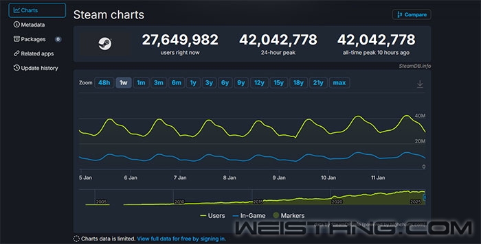 随着越来越多厂商将作品登陆Steam,平台上既有手机、主机移植游戏,也涵盖原生PC大作和大量独立游戏,且不乏免费作品,Steam已成为数字游戏的天堂。 据统计平台SteamDB数据显示,1月11日晚,Steam平台同时在线玩家数突破4204万人,刷新历史纪录。 此前的最高纪录出现在2026年1月4日,当时同时在线人数为41816052人,其中有13399958名玩家正在游戏中。 此外,在2025年德国科隆游戏展开发者大会上,Valve工作人员Erik Peterson透露,过去五年间,Steam游戏内同时在线用户数量增长超过2000万,日本、巴西、中国、德国和美国成为增长最快的市场。 数据显示,2024年8月至2025年8月期间,Steam平均每天新增约10.9万名玩家,平均每分钟新增玩家超过75人,用户规模仍在持续扩大。 |