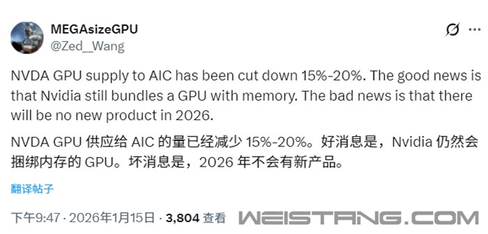 对于游戏玩家而言,2026年的显卡市场恐怕将迎来一场持久的寒冬。 据知名爆料人MEGAsizeGPU透露,NVIDIA近期已将其对AIC合作伙伴的GPU供应量削减了15%至20%,这几乎肯定会进一步推高显卡价格,这也意味着显卡危机远未结束,而是才刚刚开始。 其还表示,虽然供应量将被削减,NVIDIA仍将把GPU与显存捆绑在一起销售,而不像之前报道的那样停止与GPU一起供应显存,当GPU供应减少时,捆绑与否或许已经不重要了。 受供应收紧和DRAM短缺影响,NVIDIA旗下的RTX 50系列价格早已失控,在过去的三个月里,RTX 5080的涨幅高达35%,而旗舰RTX 5090的价格更是飙升了79%。 与此同时,AMD搭载RDNA 4架构的RX 9700系列虽然也受到波及,但涨幅相对温和,RX 9070 XT约上涨17%,RX 9070的涨幅约为15%。 但没想到的是,Intel的锐炫B系列反成为了唯一的清流,B580和B570分别降价4%和9%,展现出对消费者极其友好的一面。 MEGAsizeGPU还声称NVIDIA在2027年之前没有发布任何新GeForce显卡的计划,无论是RTX 50 Super,还是基于Rubin的RTX 60系列,在今年都不会现身。 对与减少供应这一消息,NVIDIA向Wccftech回应称:“GeForce RTX GPU的需求强劲,显存供应有限。我们继续发货所有GeForce产品,并与供应商密切合作,以最大限度地提高显存供应。” |