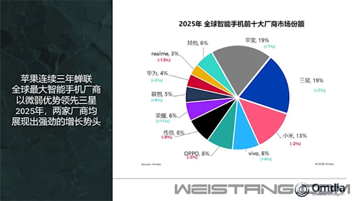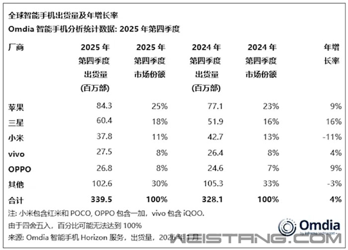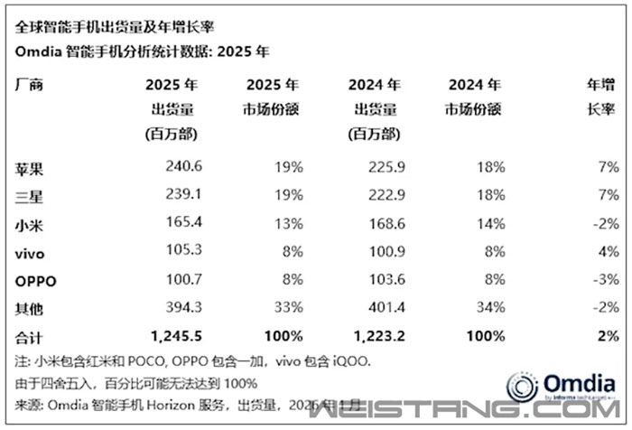 Omdia数据显示,2025年全球智能手机出货量增长2%,达到12.5亿部,为2021年以来的最高水平。 苹果创下年度出货量新高,iPhone出货量同比增长7%至2.406亿部,使其连续第三年保持全球最大智能手机厂商的地位。 第四季度iPhone出货量创历史单季度最高,推动全年表现,其中中国大陆市场同比增长26%,主要是受iPhone 17系列需求强劲推动。 三星在经历连续三年的年度下滑后于2025年实现显著反弹,同比增长7%,出货略低于苹果。 小米在2025年捍卫了前三地位,尽管年末表现承压。受到入门机型疲软以及关键市场大幅收缩影响,第四季度出货量下降2%。 与此同时,得益于在印度市场持续成功及国内市场稳定表现,vivo首次跻身第四名,全年出货量同比增长4%至1.053亿部。 OPPO排名第五,其出货量2025年上半年经历了挑战,随着A6x系列新机发布于2025年第四季度回到增长轨道,全年出货量达1.007亿部,同比下降3%。 随着realme(真我)自2026年并入OPPO后,OPPO体系将更为庞大,有望取得更高排名。 值得注意的是,在前五名之外,有多家厂商保持正向增长,荣耀和联想分别同比增长11%和6%,创下历史新高。 华为持续回升,五年来首次重夺中国大陆市场第一的位置。 Nothing则成为2025年增长最快的厂商,出货量同比暴增86%,突破300万部。 |