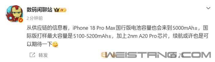 据博主数码闲聊站透露,供应链渠道确认iPhone 18 Pro Max国行版电池容量将首次突破5000mAh±。 采用eSIM的国际版电池更大一些,打样阶段最大容量达5100-5200mAh±。 作为对比,国行版本的iPhone 17 Pro Max电池仅为4823mAh,iPhone 17 Pro则是3988mAh。 iPhone 18 Pro Max已经成为苹果电池容量最大的手机,再搭配上2nm工艺的A20 Pro芯片,将刷新iPhone史上最强续航记录。 据悉,A20 Pro将采用台积电N2 2nm制程,相较上代A19芯片,CPU/GPU性能提升15%,能效比优化30%,能大幅提升续航表现。 当然了,电池容量对比国产旗舰还是差距较大。 目前国产旗舰全面普及硅碳负极电池,在电池能量密度不断刷新的基础上,即便是相对小尺寸的旗舰,也能实现7000mAh以上的电池。 iPhone 18 Pro系列将在今年9月发布,除了电池和芯片的升级之外,最令人期待的是屏幕改版。 已有多方爆料提到,iPhone 18 Pro系列将采用屏下Face ID模组,实现屏幕单挖孔,告别目前的感叹号挖孔,屏占比会大幅提升。 |