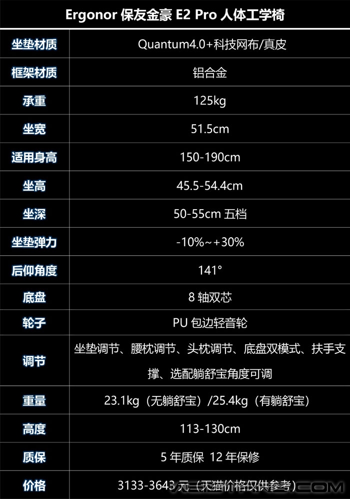 随着生活方式的迭代,从最初的席地而坐到如今的多元适配,座椅早已不再是单纯的坐具,而是适配不同场景的功能化用具,更是应对久坐问题的健康解决方案。研究显示,久坐时臀部压力集中区域承受的重量是站立时的 3 倍,普通座椅无法有效分散压力,极易引发腰臀酸痛、血液循环受阻甚至痔疮等健康隐患,而当下品类细分的人体工学椅,无论是办公、电竞还是学习款,核心均是通过科学设计精准贴合人体曲线、提供专业支撑,以此分散身体压力,实现久坐的舒适与健康放松。 以国内人体工学椅领域的领军品牌保友为代表,其高端的金豪系列就主打这样的核心设计,售价 3k + 的金豪 E2 Pro 更是该系列的代表,今天就来和大家详细聊聊这款人体工学椅的实际表现。 Ergonor保友金豪E2 Pro人体工学椅 金豪E2 Pro三种颜色 黑色网 银白网 黑色皮质 参数表 从参数上就看得出来这款金豪E2 Pro人体工学椅的可调位置相当之多,坐垫的材质有网布和真皮可选,此次收到的是银白网布款,设计上兼顾了支撑性和透气性,皮质则侧重质感和耐用性,在意的同学可以考虑,另外还有云感科技坐垫款可选。网布可自由调节松紧程度,满足不同体重,承重实测下来达到标称没问题。身高方面分别邀请了161cm、173cm和180cm的同学体验,通过调节坐高、坐深、靠背高度等,均可适配,体验感舒适。后仰时不同于传统弹簧,小体重基数的同学比较费力,这款金豪E2 Pro采用二代复合玻纤弹片,后仰可以做到丝滑流畅。还有座椅的旋转和滑动,整体感觉也是顺滑无阻的,甚至躺卧的时候会受力旋转,晕车严重的小伙伴慎选躺舒宝(说笑),有午睡需求的可以考虑。金豪E2 Pro 3k级的售价,官方提供了5年的质保,还有12年保修,也是很靠谱了,在一定程度上也能抵消一些价格上的顾虑。 |