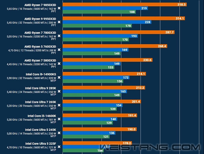 生化危机新作《生化危机:安魂曲》定于今天发售,官方给出的推荐配置仅为RTX 2060或RX 6600搭配i7-8700/Ryzen 5 5500。 不过根据PC Games Hardware的实际测试,在高端平台对决中,AMD与Intel的帧率差距堪称悬殊。 测试采用1080p分辨率与RTX 5090显卡,重点对比当前两大阵营最强游戏处理器:AMD锐龙7 9850X3D与Intel酷睿i9-14900KS。 结果显示,在统一使用DDR5 5600MT/s内存的基准下,两者平均帧率上的差距竟然接近50%,9850X3D毫无争议地坐稳了游戏之王的宝座,前三甲被9850X3D、9950X3D与7800X3D包揽。 如果为Intel平台搭配更高频率的内存进行超频,两者的鸿沟可能会有所收窄,但仍难以撼动AMD的整体领先。 不过Intel并非全面溃败,在衡量流畅度的关键指标1%低帧方面,Intel缩小了部分差距。 在开启光线追踪的测试中,AMD X3D芯片依然保持领先,只是领先幅度较纯光栅化渲染时有所收敛。 |