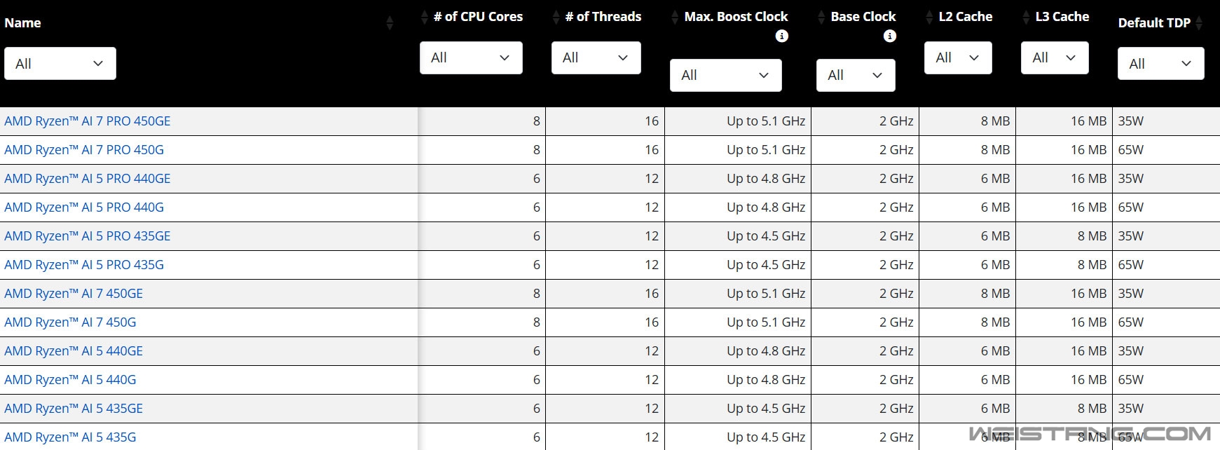 AMD日前公开发布了锐龙AI PRO 400G系列,基于最新的Zen5 CPU、RDNA3.5 GPU架构,但仅面向商务台式机,那么是否还会有消费级零售版呢? 在AMD官网上,零售版的锐龙AI 400G系列悄然上线了! 它就是锐龙8000G系列的后继者,也就是之前传说中的锐龙9000G系列,如今改名首次加入AI,也和移动端保持步调一致。 锐龙AI 400G系列依然基于移动版的Strix Point核心(台积电4nm工艺),这也是桌面APU的惯例了。 一共六款SKU型号,具体规格和对应的PRO系列完全一致: 锐龙AI 7 450G/450GE: 8核心16线程,二级缓存8MB,三级缓存16MB,基础频率2.0GHz,加速频率5.1GHz,集成Radeon 860M GPU,8个单元,加速频率3.1GHz,NPU算力50 TOPS,热设计功耗65/35W。 锐龙AI 5 440G/440GE: 6核心12线程,二级缓存6MB,加速频率4.8GHz,集成Radeon 840M GPU,4个单元,加速频率2.9GHz,其他同上。 锐龙AI 5 435G/435GE: CPU加速频率降至4.5GHz,GPU加速频率降至2.8GHz,其他同上。 要知道,上一代锐龙8000G APU的最高端型号,锐龙7 8700G,也是8核心16线程、5.1GHz加速频率、24MB缓存、65W热设计功耗,因此这一代主要升级了CPU架构、GPU架构和规格。 移动版的10/12核心,并未来到桌面。 另外,上一代低端还有4核心,这次取消了。 |