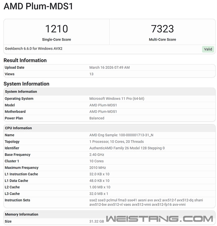 AMD Zen6架构传闻已久,终于看到真家伙了! GeekBench 6数据库里出现了一套新的AMD工程平台,代号“Plum-MDS1”,其中MDS显然就是“Medusa Point”的缩写,也就是AMD的下一代移动端平台。 检测信息显示,新处理器有10个核心,每核心二级缓存1MB,共享三级缓存总量32MB。 作为对比,目前的Strix Point即锐龙AI 300/400系列最高12核心、24MB三级缓存,而更早的Hawk Point即锐龙7040/8040系列最高8核心、16MB三级缓存。 根据之前曝料,Zen6将七种不同的核心数量配置,其中单CCD的有6核心、8核心、10核心、12核心,双CCD的则有16核心(8+8)、20核心(10+10)、24核心(12+12)。 显然,这里的10核心是残血版本,屏蔽了两个核心,至于32MB三级缓存缓存也有可能不是全部,36MB看上去才够完美,甚至据说要做到48MB。 频率检测显示为2.4GHz,实际运行更接近1.3GHz,毕竟是早期样品嘛,频率都高不到哪里去。 另外,进出口清单上也出现了AMD Zen6的身影,OPN编号为000001713,并显示热设计功耗28W,确认是移动版本,FP10封装。 不过,核心配置显示4C+4D,也就是4个Zen6加4个Zen6c,一共才8个核心,不知道是哪里错了。 大概率可能是GeekBench 6检测失误(很常见),毕竟8核心配32MB三级缓存更合理,也与最多12核心配48MB三级缓存的说法相符合。 |