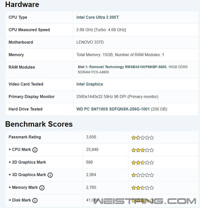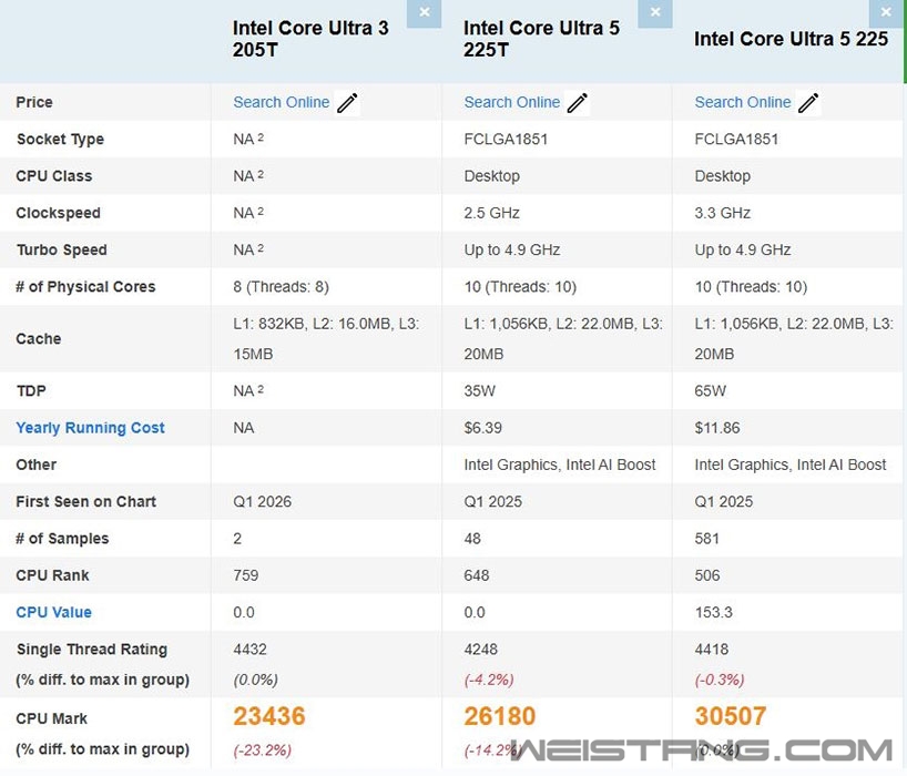 Intel Arrow Lake系列定位入门级的酷睿Ultra 3 205T近日首次现身PassMark跑分库,在单核性能上竟以4%优势反超定位更高的Ultra 5 225T。 虽然平常在零售市场上看到的Arrow Lake系列不多,但其实该系列产品还是很多,只不过Intel将多个型号当做了OEM专属,这就是在零售市场上看不到酷睿Ultra 3 205T或Ultra 5 225T的原因。 实测数据显示,Ultra 3 205T单核得分4432分,小幅领先Ultra 5 225T约4%;多核得分23436分,因核心数量劣势落后后者约10%。 值得注意的是,目前该平台仅收录两份Ultra 3 205T样本,数据误差相对较大,后续成绩或更趋稳定。 规格层面,Ultra 3 205T采用8核心设计,配备15MB三级缓存,较10核20MB缓存的Ultra 5 225T明显精简,两者TDP均未35W,面向紧凑型与超轻薄设备。 测试细节显示,该芯片最高睿频可达4.68 GHz,第二份样本的多核成绩更飙升至25949分,几乎追平Ultra 5 225T平均水平。 |