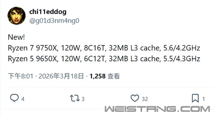 Intel、AMD今年都没有全新的桌面处理器,都是现有产品线的补充升级。 Intel这边刚发布了酷睿Ultra 7 270K Plus、酷睿Ultra 5 250K Plus,增加E核、提升频率、加速互连。 AMD年初带来了锐龙9 9850X3D,最强游戏神U再提速,后续还有首次双CCD堆叠3D缓存的锐龙9 9950X3D2。 你以为这就完了? 最新情报显示,AMD还在准备锐龙7 9750X、锐龙5 9650X,作为对Intel Plus系列的反击。 很显然,它俩分别是锐龙7 9700X、锐龙5 9600X的升级版,加速频率都提升100MHz,分别达到5.6GHz、5.5GHz。 基础频率则都提升了400MHz,分别来到4.2GHz、4.3GHz。 代价却也不小,热设计功耗均从原来的65W提高到120W,几乎翻倍。 同时,它俩分别还是8核心、6核心,三级缓存均为32MB。 发布时间不详,估计不会太久了。希望不要涨价。 |