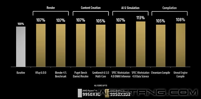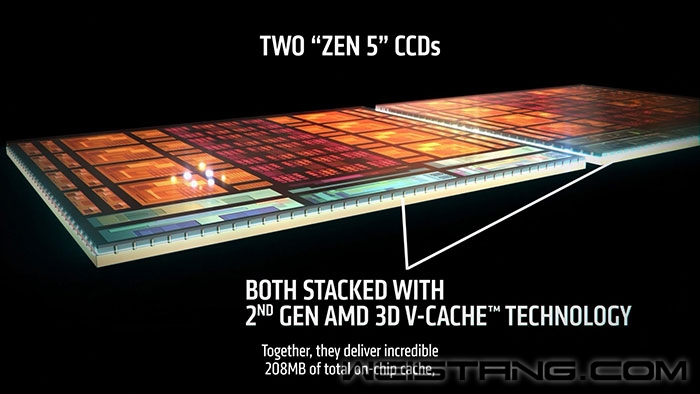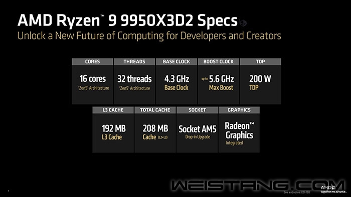 AMD传闻已久的双堆叠3D V-Cache处理器终于发布,定名为AMD锐龙9 9950X3D2双缓存版台式处理器 这是AMD首次推出双CCD同时堆叠缓存的处理器,终结了以往仅单CCD拥有大缓存的非对称设计。 规格方面,该处理器基于Zen 5架构,拥有16核心32线程,基础频率保持在4.3GHz,加速频率为5.6GHz,较单堆叠版本略微下调100MHz。 由于双缓存模组对功耗提出了更高要求,其默认TDP提升至200W,创下AM5平台新高。 核心层面的最大改变在于,两个CCD各自拥有64MB 3D缓存,再加上原生的16MB二级缓存、64MB三级缓存,整颗处理器的总缓存达到了惊人的208MB。 性能表现上,Jack Hyunh表示9950X3D2在游戏和生产力方面都非常出色,性能比9950X3D高5-10%。 在V-Ray、Blender渲染测试中增幅达7%,SPEC数据科学测试提升高达13%,甚至在Chromium和虚幻引擎编译任务中也有5%到8%的提速。 目前该处理器价格暂未公布,将于4月22日上市。 |