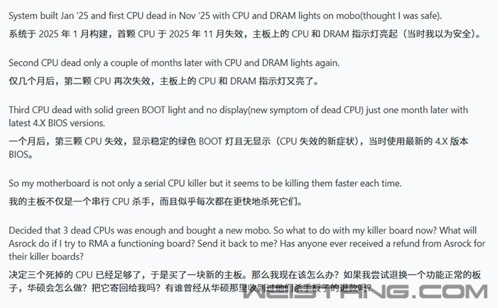 据Reddit用户notmember反馈,其一块华擎B850M PRO RS WiFi主板在数月内连续烧毁三颗AMD锐龙7 9800X3D处理器,最终用户在AMD三次换新后选择彻底弃用这块主板。 据该用户介绍,其于2025年1月组装的电脑在当年11月首次出现处理器故障,随后向AMD申请售后换了一颗CPU。 然而这颗新处理器仅存活了约两个月便再次报废,第三次换回来的9800X3D更是连一个月都没撑过。 三颗处理器均死在同一块华擎B850M PRO RS WiFi主板上,主板作为元凶的嫌疑基本可以坐实。 值得注意的是,该用户并非因为疏于维护而导致故障,他每次都保持BIOS处于最新版本:第一颗9800X3D损坏时使用的是BIOS 3.50,第二颗在BIOS 4.03下阵亡,第三颗则是在BIOS 4.07 Beta版本中报废。 而BIOS 4.07 Beta恰恰是华擎专门为修复CPU异常问题而推送的版本,其中包含了AGESA 1.3.0.0a微代码更新,但即便如此,第三颗处理器依然未能幸免。 三次更换处理器的代价和时间成本对任何玩家来说都是难以承受的,因此该用户最终选择放弃华擎主板,转投其他品牌。 |