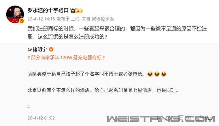 近日,罗永浩在微博公开吐槽,直指部分商家将“120W”注册为充电器商标,误导消费者以为是充电功率,引发全网热议。 罗永浩直言:“这么流氓的(商标)是怎么注册成功的?” 据悉,目前电商平台上大量标注“120W超级闪充”的充电器售价低廉,普遍低于50元。 消费者购买后发现充电速度极慢,实测功率仅22.5W左右,与宣传严重不符。 商家面对质疑辩称,“120W是商标/型号,不代表实际功率”。 更有甚者,同店销售的67W、90W、120W三款充电器,内部结构完全一致,仅贴纸与商标不同,却以不同价格售卖。 此类心机商标利用信息不对称收割消费者,将行业通用功率参数抢注为商标,再堂而皇之印在产品上。 国家知识产权局已于2026年3月集中驳回、宣告5件含“120W”的充电器商标无效。 但市场乱象仍存,部分商家将“120W”改称型号,继续销售无3C认证、存在安全隐患的劣质产品。 在此也提醒大家,电子产品尽量使用原装充电器,如需购买第三方产品,认准大品牌。 查看详细参数页的真实输出规格,如20V/6A、11V/6A等具体档位,同时确认产品具备3C认证,避免低价劣质产品损伤设备。 |