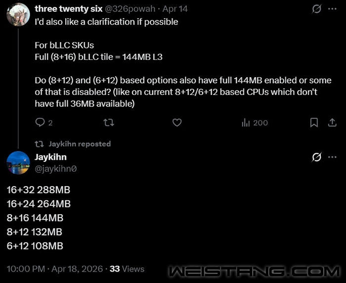 凭借3D V-Cache的优势,这两年AMD的桌面U一直在游戏性能上把Intel按在地上摩擦。但Intel必然不会一直甘居人后,终于拿出了对抗X3D的终极大招——bLLC(Big Last-Level Cache,大型末级缓存)。 作为Intel为其下一代 Nova Lake-S(酷睿Ultra 400 系列)桌面处理器开发的增强型缓存技术,bLLC可以说就是专门针对AMD 3D V-Cache而生的。 知名爆料人Jaykihn放出Nova Lake-S 桌面处理器bLLC大末级缓存的完整配置细节,最高做到288MB容量,比AMD刚发布的锐龙9 9950X3D2足足多出80MB。 和AMD的3D堆叠缓存路线完全不同,Intel的bLLC走的是纯平面 “大平层” 设计。它没有采用堆叠封装,直接把大容量缓存直接集成于计算模块 (Compute Tile) 内部,靠芯片面积硬换性能。 因为是同层集成,理论上bLLC的延迟更低,有望解决Intel当前处理器在游戏场景中延迟高、缓存结构弱的短板。 根据爆料,标准计算模块的面积为98mm²,搭载bLLC的版本直接拉到154mm²,面积暴涨36%。单颗计算模块的bLLC缓存最高可以做到144MB,双计算模块的52核心型号翻倍到288MB。 据了解,整个酷睿Ultra 400系列桌面 CPU,规划了至少13款SKU,覆盖Ultra 3到Ultra 9全档位。 功耗方面,旗舰型号最高TDP 175W,其余型号的TDP则从35W到125W不等。入门级Ultra 3和Ultra 5的TDP为35W,解锁版最高可达65W。标准版的TDP为125W,部分型号还提供65W的节能版本。 全系提供无核显的F型号,核显标配2颗Xe3 GPU,后续还会推出更高规格核显的特殊型号。 Jaykihn公布了五款SKU的缓存详情: Core Ultra X(52 核)- 288 MB Core Ultra X(44 核)- 264 MB Core Ultra 9(28 核)- 144 MB Core Ultra 7(24核)- 132 MB Core Ultra 9(22 核)- 108 MB 2026年的x86桌面市场,注定是一场硬碰硬的缓存大战。AMD把3D V-Cache拉满到双CCD,Intel直接用大力出奇迹的平面大缓存正面硬刚。 对DIY玩家来说,Intel和AMD竞争越激烈,最终带来的只会是更卷的性能和更具性价比的选择。 |