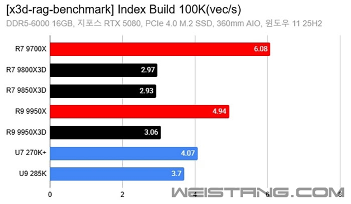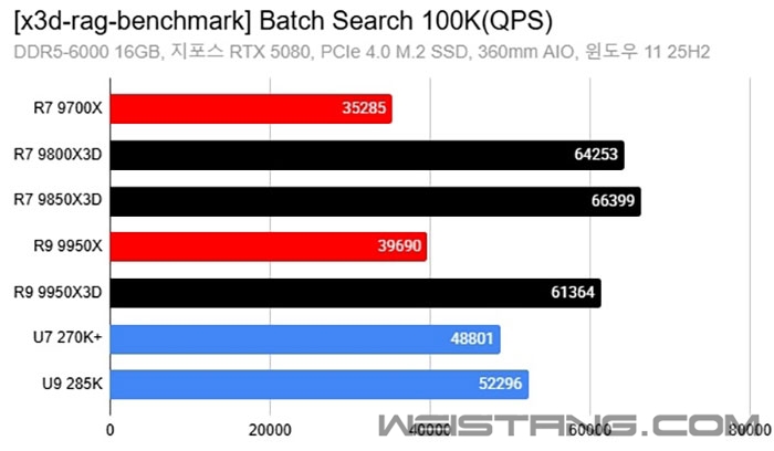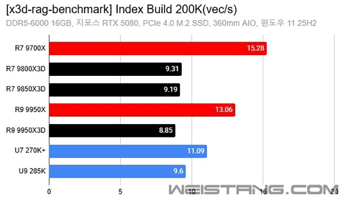 据GiggleHD实际测试,AMD X3D处理器在RAG(检索增强生成)AI基准测试中展现出远超预期的性能表现,最高领先非X3D芯片达88%。 RAG AI通过外部向量数据库检索信息来增强大模型的回答质量,与纯LLM推理不同,向量搜索的大量计算负载落在CPU而非GPU上。 随着Agentic AI工作负载的推进,搜索驱动的任务流越来越多,CPU的延迟瓶颈问题日益突出。 HNSW(分层可导航小世界)搜索算法就是典型例子,在GPU执行LLM推理的同时,CPU负责图检索,更大的缓存意味着更短的检索时间。 GiggleHD使用开源的X3D RAG基准测试,针对个人PC和小团队单节点场景(约100K-200K向量),对AMD锐龙9000X3D系列及多款非X3D芯片进行了实测。 结果显示,在100K向量批量搜索中,X3D CPU最高比非X3D芯片快88%;在200K向量测试中,同为8核的锐龙7 9850X3D比锐龙7 9700X快50%以上,且8核X3D芯片的速度超过了16核的锐龙9 9950X。 索引构建方面,100K向量测试时间缩短50%,200K向量缩短39%,并发RAG吞吐量同样由X3D芯片领跑。 差距较小的项目是TTFT(首Token时间)吞吐量,因为该任务主要依赖GPU而非CPU。 AMD X3D搞AI居然比打游戏还猛!8核暴打16核 领先幅度高达88% |