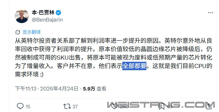 客户正在疯狂买买买,甚至包括一些有缺陷的CPU芯片。 Intel2026年第一季度财报业绩大幅超预期引发关注。据报道,该公司已证实,已将原本会被当作废品处理的低质CPU推向市场获利,而面对极度旺盛的行业需求,下游客户对这些芯片照单全收,甚至出现了抢购的情况。 4月23日,Intel发布2026财年第一季度财报。财报显示,公司当期营收达136亿美元,远超市场预期的123.6亿美元;非GAAP毛利率达到41%,较公司自身给出的34.5%指引高出650个基点,每股收益更是超出市场预期3000%。 如此巨大的差距令分析师们不禁好奇,究竟是什么让Intel业绩如此亮眼?而答案似乎部分在于一些存在缺陷的芯片。 科技行业分析师本・巴加林(BenBajarin)对外披露,他已直接从Intel投资者关系团队获悉。公司利润率的意外提升,至少有一部分来自于原本会被归为废品或低预期产出的CPU销售,这些产品为Intel带来了实打实的营收增量。 在芯片制造过程中,同一片晶圆切割出的芯片,性能和品质有好有坏,也就是大家常说的良率。晶圆中心区域切割出的芯片,性能更稳定,缺陷更少。晶圆边缘切割出的芯片,往往缺陷更多,性能表现更差。 按照行业常规操作,达不到高端型号规格但仍可使用的芯片,会被降档标定为低端型号销售。还有一部分边缘芯片,连降档的标准都达不到,最终只能被当作报废品处理。 如今CPU市场需求极度旺盛,客户愿意采购这些原本会被报废的芯片。Intel只需将这些芯片降档标定为低规格型号,就能顺利完成销售。 这部分额外收益,并非来自芯片工艺提升,也不是来自成本控制优化,纯粹是旺盛的市场需求,让原本几乎没有商业价值的芯片实现了变现。 这一罕见现象的背后,是AI浪潮带动的全行业算力建设热潮。AI基础设施建设,正在以远超供应链设计上限的速度消耗算力,直接催生了对服务器处理器的海量需求。 当下,作为是AI数据中心的核心硬件,Intel至强系列CPU始终处于持续高需求状态。戴尔、惠普、联想等头部整机厂商,以及微软、谷歌、亚马逊等云服务巨头,都在大规模采购Intel处理器。 管它好与不好,能用就行。 |