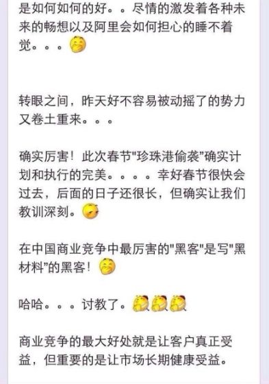 今日有微博网友截图显示,马云昨日在来往上表示,腾讯的“微信红包”如同“珍珠港偷袭”,虽然在短期获得了一定效果,但春节很快就会过去,让市场长期健康收益才最为重要。 针对网上一些“微信红包超越支付宝”的消息,马云指出,在中国商业竞争中最厉害的“黑客”是写“黑材料”的黑客!暗指腾讯针对支付宝展开的公关战。