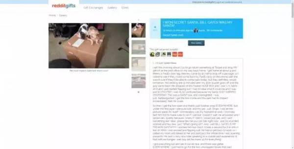 Redditgifts是这么玩的:每隔一段时间,网站都会举办不同节日主题的神秘礼品传递活动。这个用户注册、登陆,填写个人信息(可以填上自己喜欢什么),然后关联自己的 Reddit 账户,就可以去活动里报名了。活动开始后,系统会自动帮用户配对另外两个用户。 为什么是两个用户呢?这是因为,既然是“传递”,每个参加活动的用户,其实都会配对到一个上家和一个下家。在这场“神秘圣诞老人” (Secret Santa) 活动里,上家就是神秘圣诞老人……Ta需要在指定的时间内,按照网站显示的收件地址,从网站上挑选礼物然后发出去。 其实,在去年的神秘圣诞老人配对中,Aerrix 没能完成配对。幸好,Redditgifts 还有“重新配对” (rematch) 这个功能——在网站上,专门有一些好心人注册成重新配对,给那些没有找到配对的人送去温暖,自己却不会因此收到礼物。 比尔·盖茨就是这样一个好心人…… 收到礼盒的当天上午,Aerrix 正好去了邮局把自己的礼物发出去。她打开礼盒,拿出了好几吨气泡纸,然后惊呆了:这不是比尔·盖茨吗!