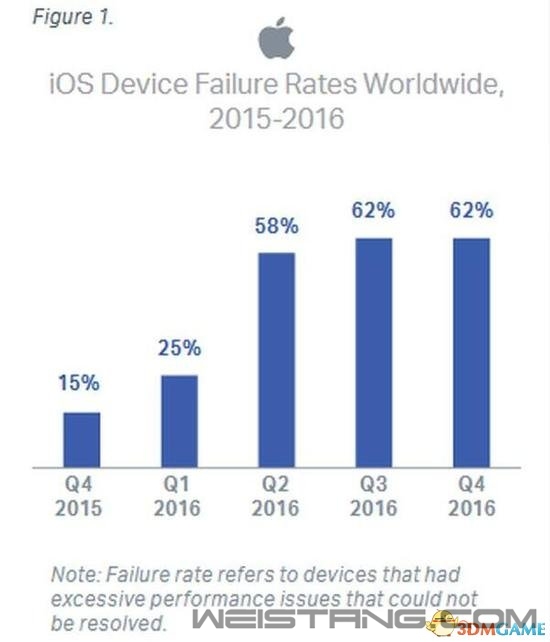 据科技公司Blancco的一份报告显示,iPhone手机相比Android系统手机更加不靠谱,这是由于在过去的一年中,其出现了众多性能问题,以及极高的故障率所导致的。 从报告中我们看到,iOS设备在2015年Q4季度的故障率为15%,但在随后的一段时间里,其故障率开始飙升,到2016年第四季度,iOS设备的故障率竟然高达62%!相比之下,Android设备故障率由2015年Q4季度的85%,降低至2016年Q4季度的47%,比iOS设备低了15%,从侧面说明Android设备在这几年当中的稳定性确实有很大的提升。 来看看出现问题的具体机型,其中故障率最高的为iPhone 6,在2016年第四季度,其故障率高达15%,而在2015年第四季度,其故障率为惊人的30%。另外iPhone 6s、iPhone 5s、iPhone 6 Plus等等也是故障率较高的机型。 在故障问题中有电池、WiFi连接问题、蓝牙问题、触控屏幕问题,以及各种应用和照片同步问题。