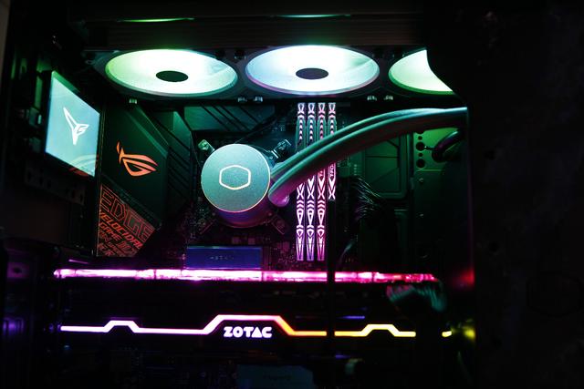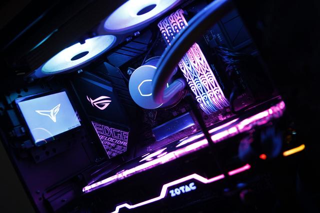 几乎我们在正面看到的带有亚克力的部分都是可以发光的。现在机箱的硬件里面,除了CPU不能散热,好像其他配件几乎都是可以发光的。而且还都是RGB。其实发光这个事除了好看以外,我觉得最大的作用就是可以初步判断那个硬件是不是在正常工作。 显卡中央上方的PGF是索泰显卡里高端的代名词。从风扇的缝隙中也可以看到在里面一整片都是散热鳍片。