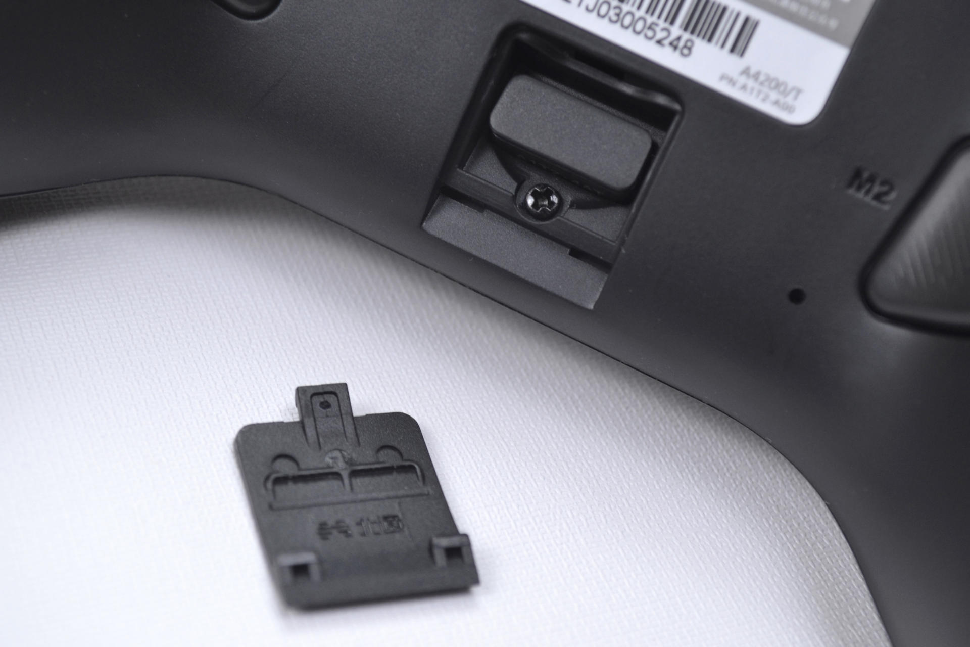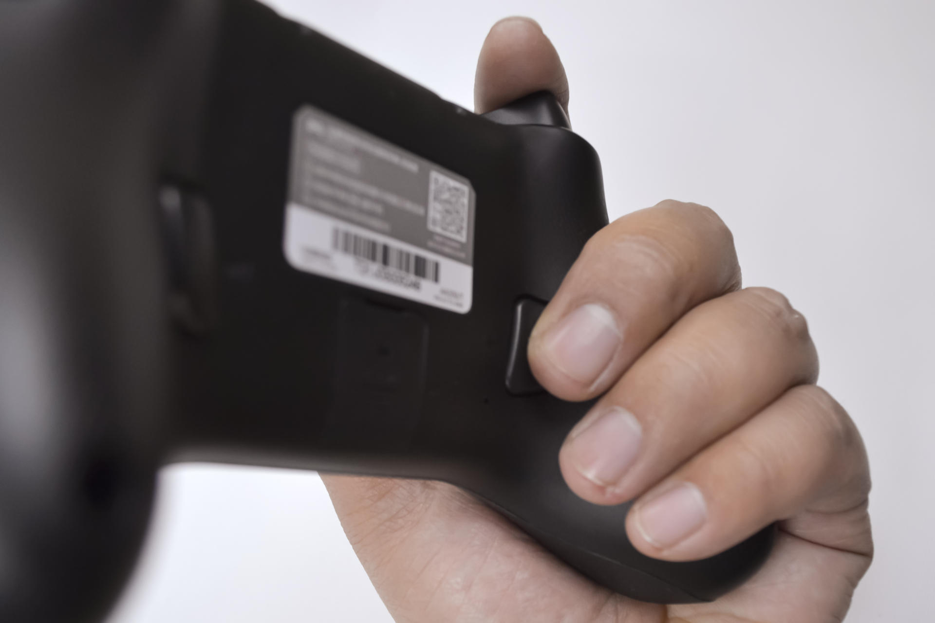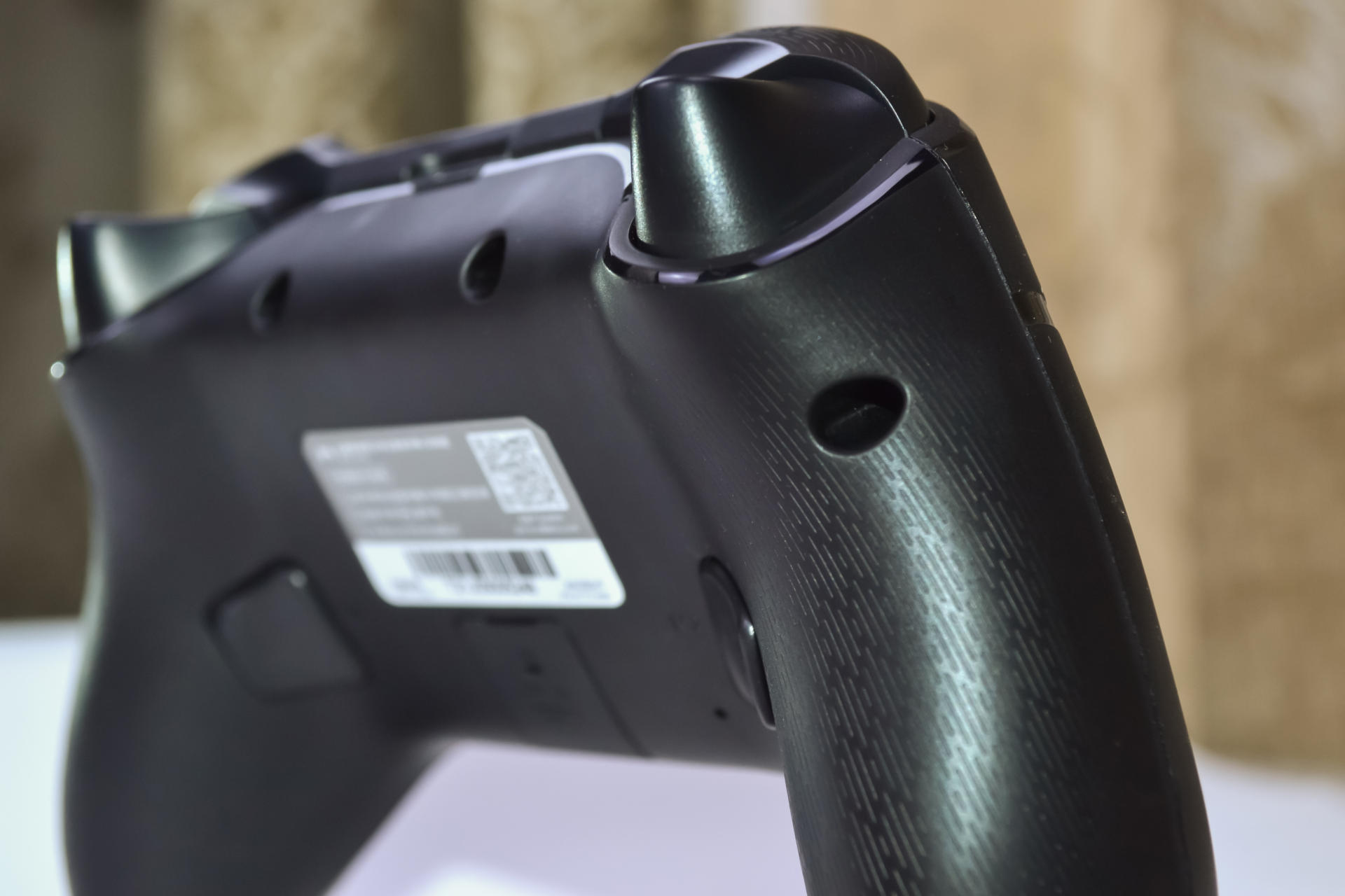 手柄的背面能够看到手柄的产品标签,以及左右两个功能性按键,中间的部分是一个盖子,这两个功能按键就是宏编程竞技按键。