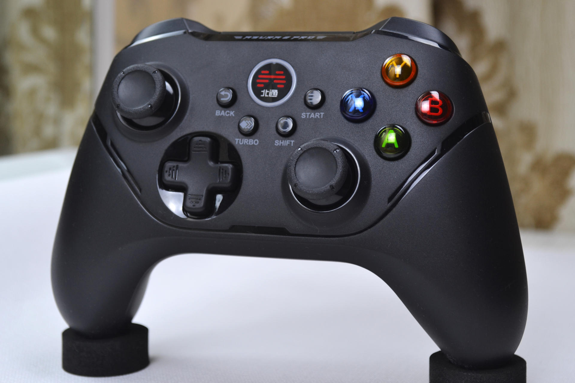局部特写能够看到游戏手柄的logo特别显眼,个人感觉这次北通将logo进行一个包围封装起来,让北通的logo更为显眼了。logo的周围围绕着四个功能按键,分别是BACK,START、TURBO、SHIFT四个功能按键,这里着重说下TURBO按键,开机状态下按住Turbo键,再按下任意按键实 按键连发功能;SHIFT按键可以将摇杆与十字键的功能互换,用十字键控制方向,可以更好的体验横版、模拟器等游戏;重复一次该操作取消按键连发功能。懂得使用的话能省很大力气。