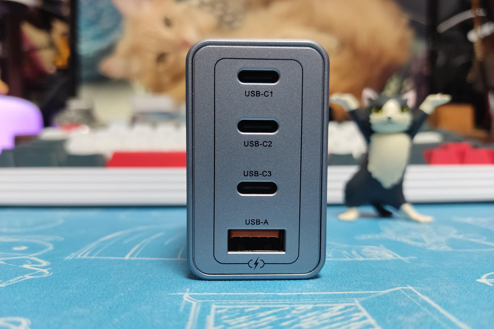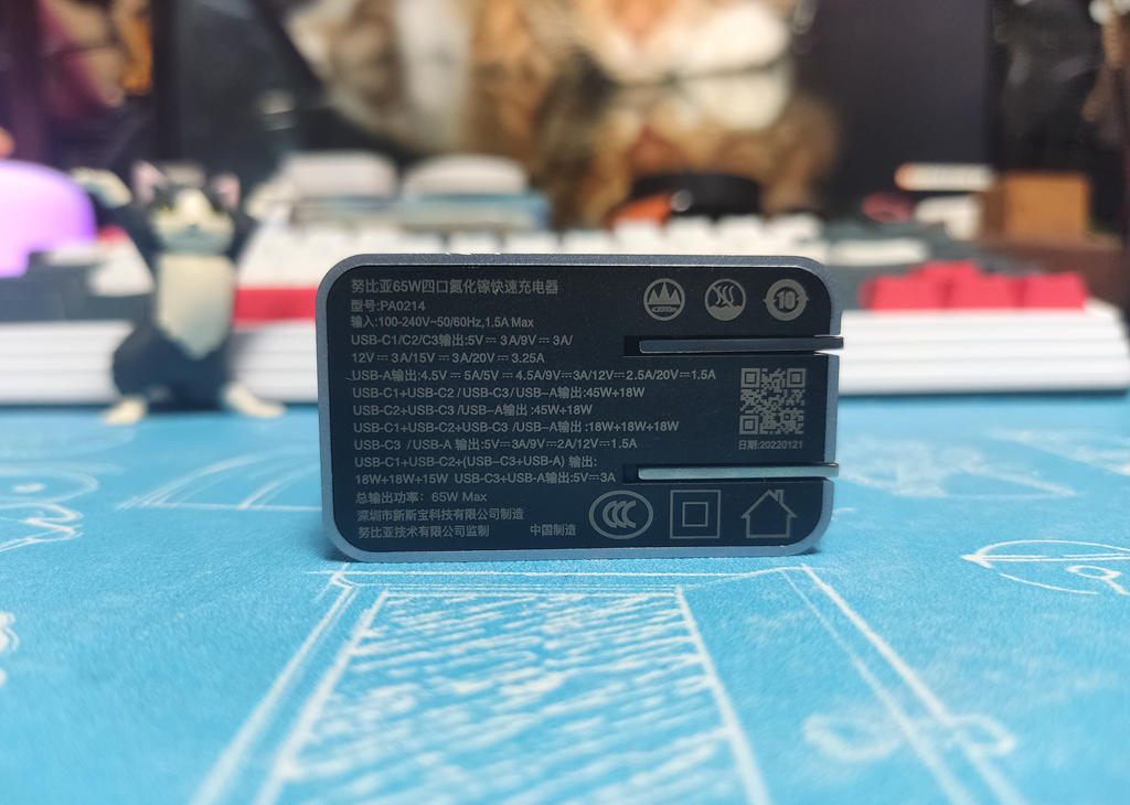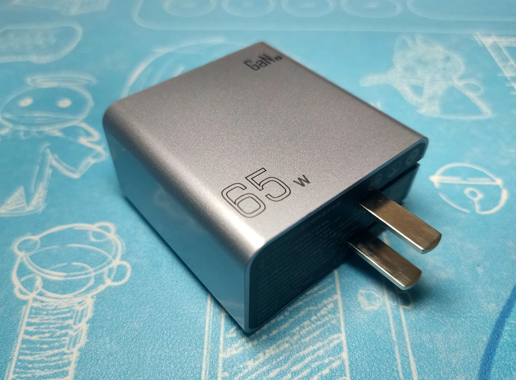 插头底面印有这款快充的技术参数等信息。USB-C1/C2/C3口支持 5V=3A、9V=3A、12V=3A、15V=3A 和 20V=3.25A 五个常见的电压档以及 PPS:3.3V-21V=3.25A,有着更好的设备兼容性。USBA口支持4.5V=5A、5V=4.5A、9V=3A、12V=2.5A、20V=1.5A 五个电压档;USB-C1、C2和C3口均支持最高65W单独输出,USB-A口最高支持30W单独输出。