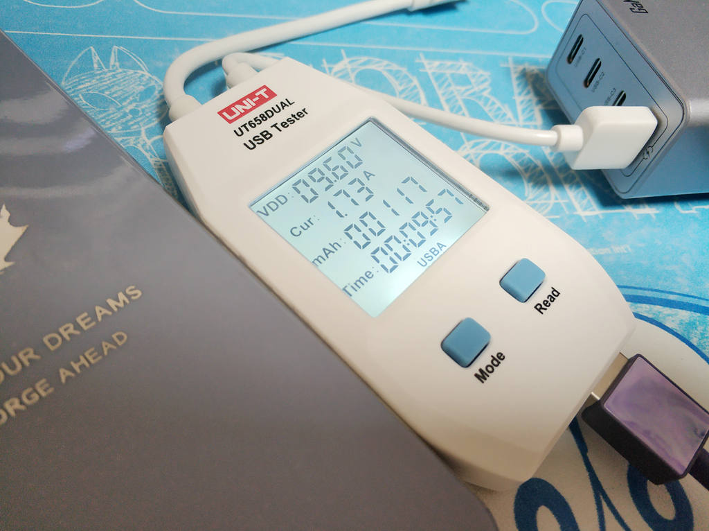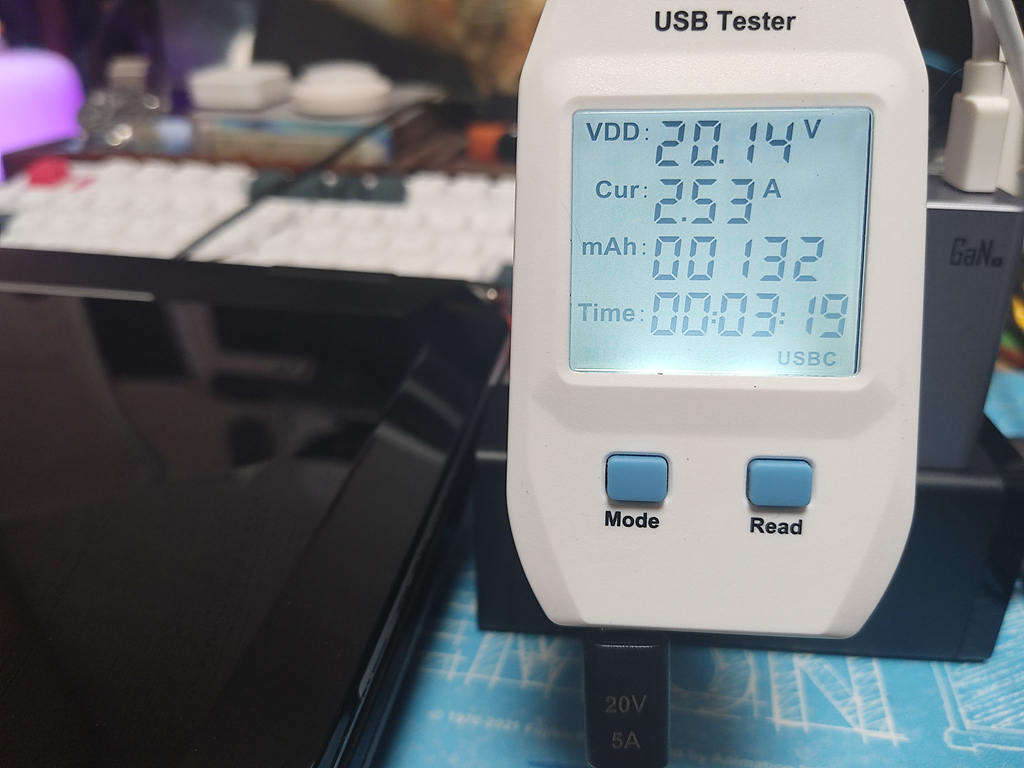 C1/C2/C3口支出三口盲插,日常使用很方便,单独使用C口给笔记本充电,笔记本此时电量为剩余5%,实时充电功率约51w,1个小时不到就充满了,速度很快。