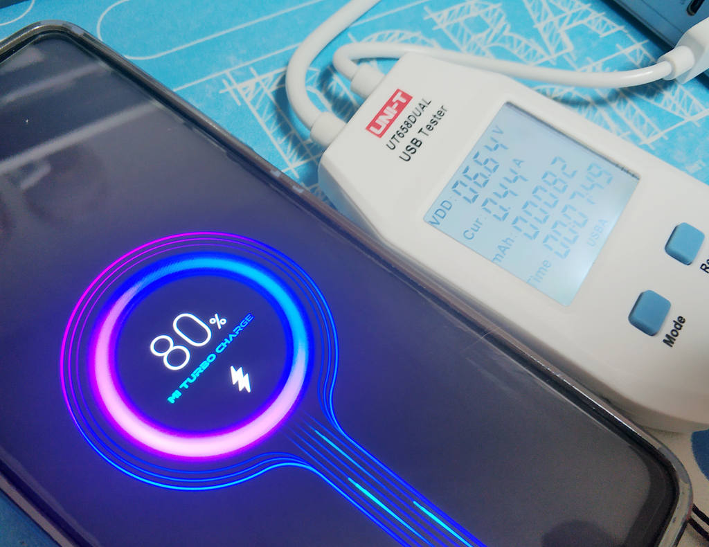 单独使用USB-A口给K30手机充电,剩余电量80%,实时充电功率为16.6W,同时USB-A还支持MI TURBO CHARGE超级快充;
