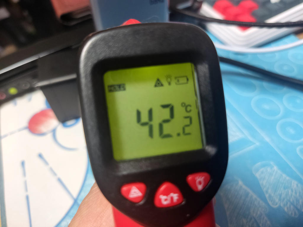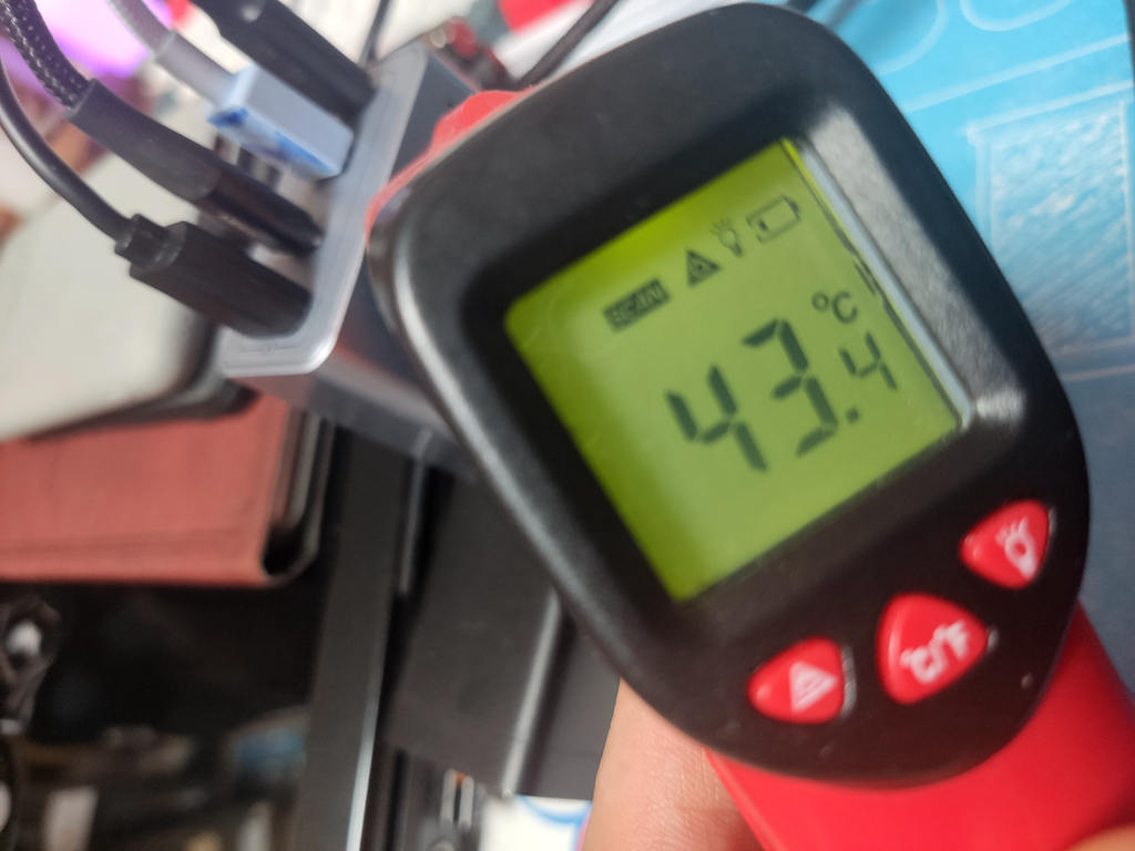 室温15℃,满载使用1小时后,测得充电器两侧与顶部最高温度分别为:43.4℃、42.2℃和40℃。努比亚这款充电器虽然体积小,温度控制得还挺不错。
