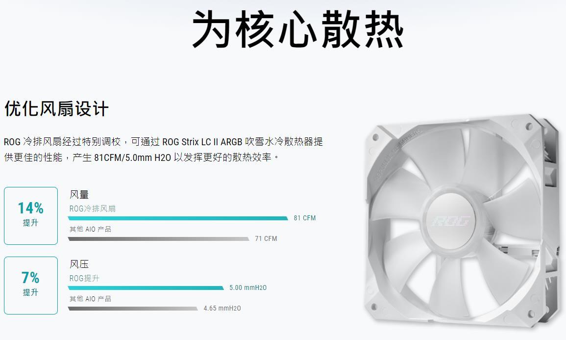 三枚ROG 定制120mm RGB风扇,乳白色扇叶可以很好透光,颜值和性能更好,最高2500转,37.6分贝,风量提升14%,风压提升7%。