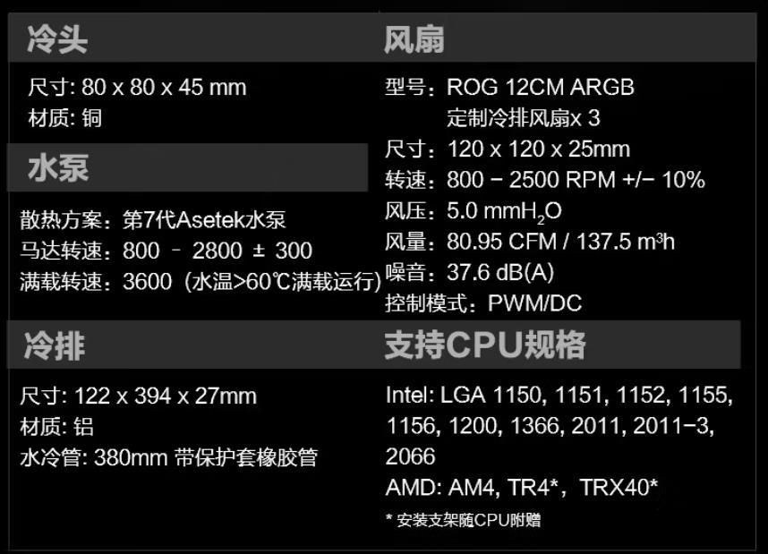 包含水冷套件、三个120mm ARGB散热风扇、英特尔和AMD的平台扣具、一分三风扇控制线、5V3Pin的ARGB灯控制线、冷头USB控制线、ROG贴纸、安装手册和保修卡等。支持几乎所有平台,兼容英特尔、AMD全系列平台,包括新锐龙AM5以及13代酷睿LGA1700。