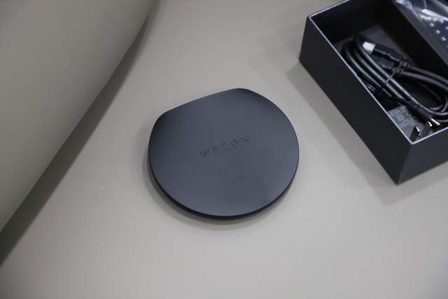 WEBOX WE40S的机身背面为产品铭牌,并在底部设计有一圆圈的防滑硅胶垫,可以让电视盒子稳稳放置在玻璃或木质台桌上。