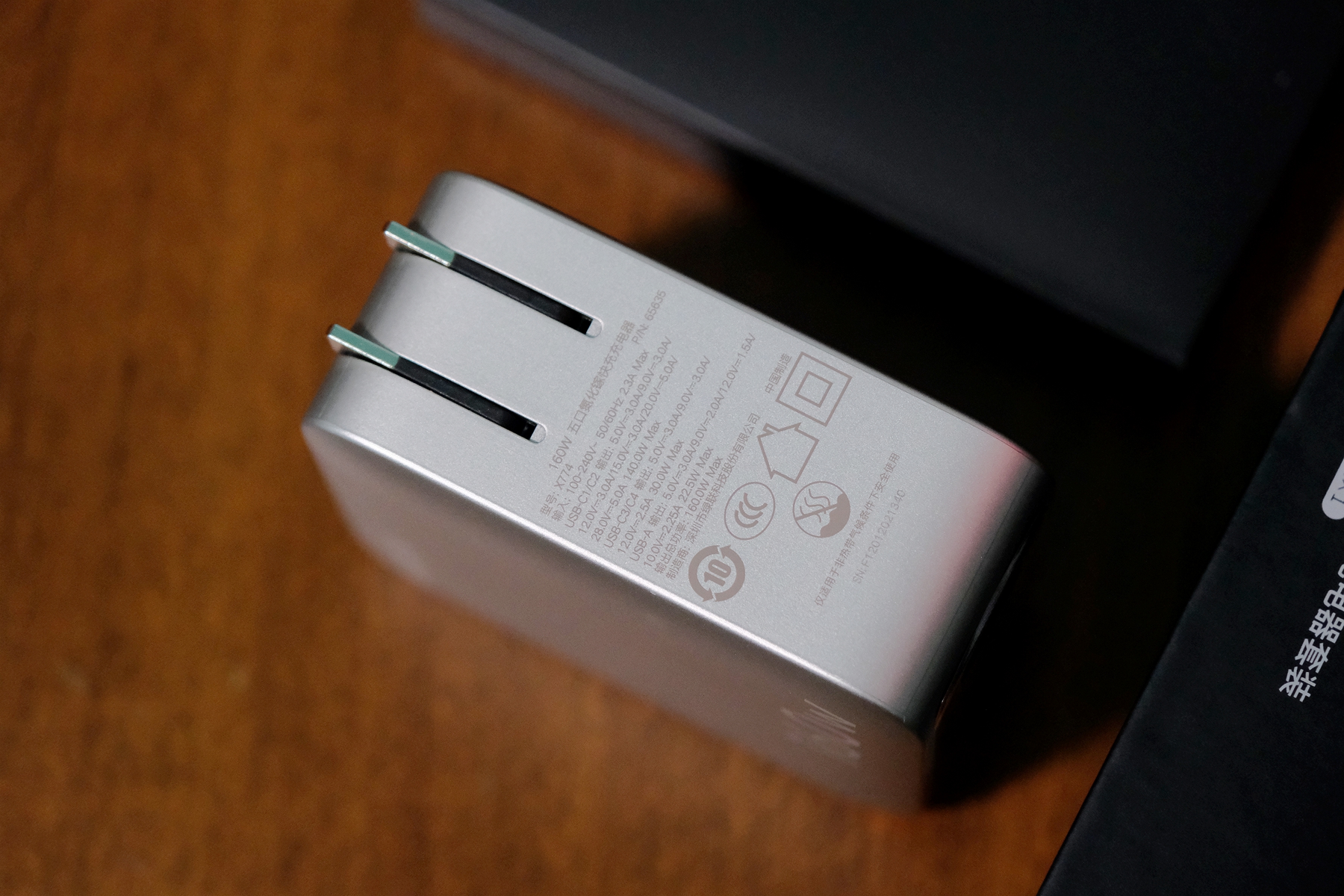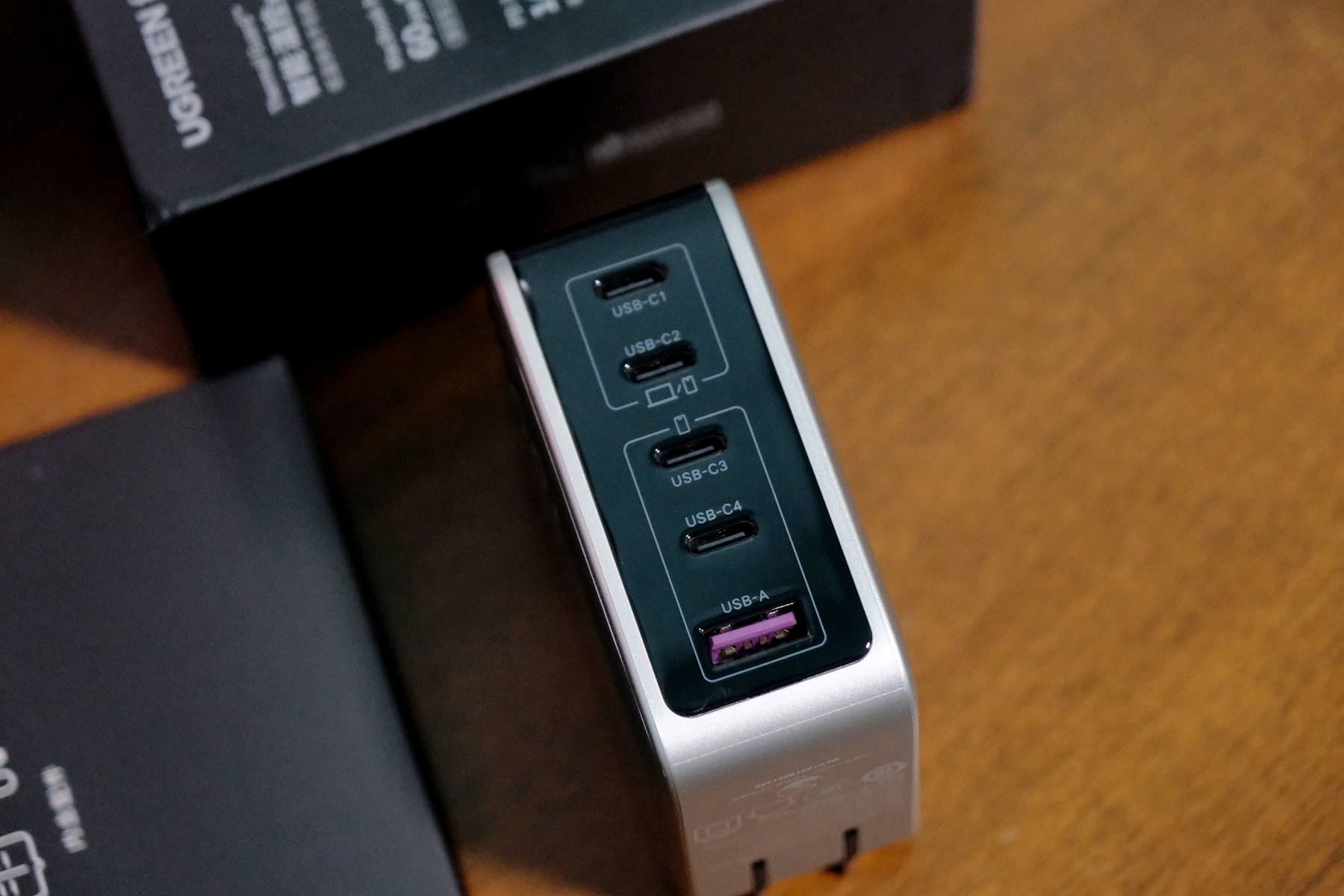另一侧面则是五个充电接口的布局,采用的是USB接口4C1A的方案,兼顾了日常使用的实用性,充电器的总输出功率最高为 160W,单口最高支持140W输出,其中 USB-C1/C2 接口支持 PD 3.1 140W 功率(支持盲插),这两个接口比较适合笔电和PD等设备充电,USB-C3/C4 接口支持 30W 快充,USB-A 支持 22.5W 快充▼