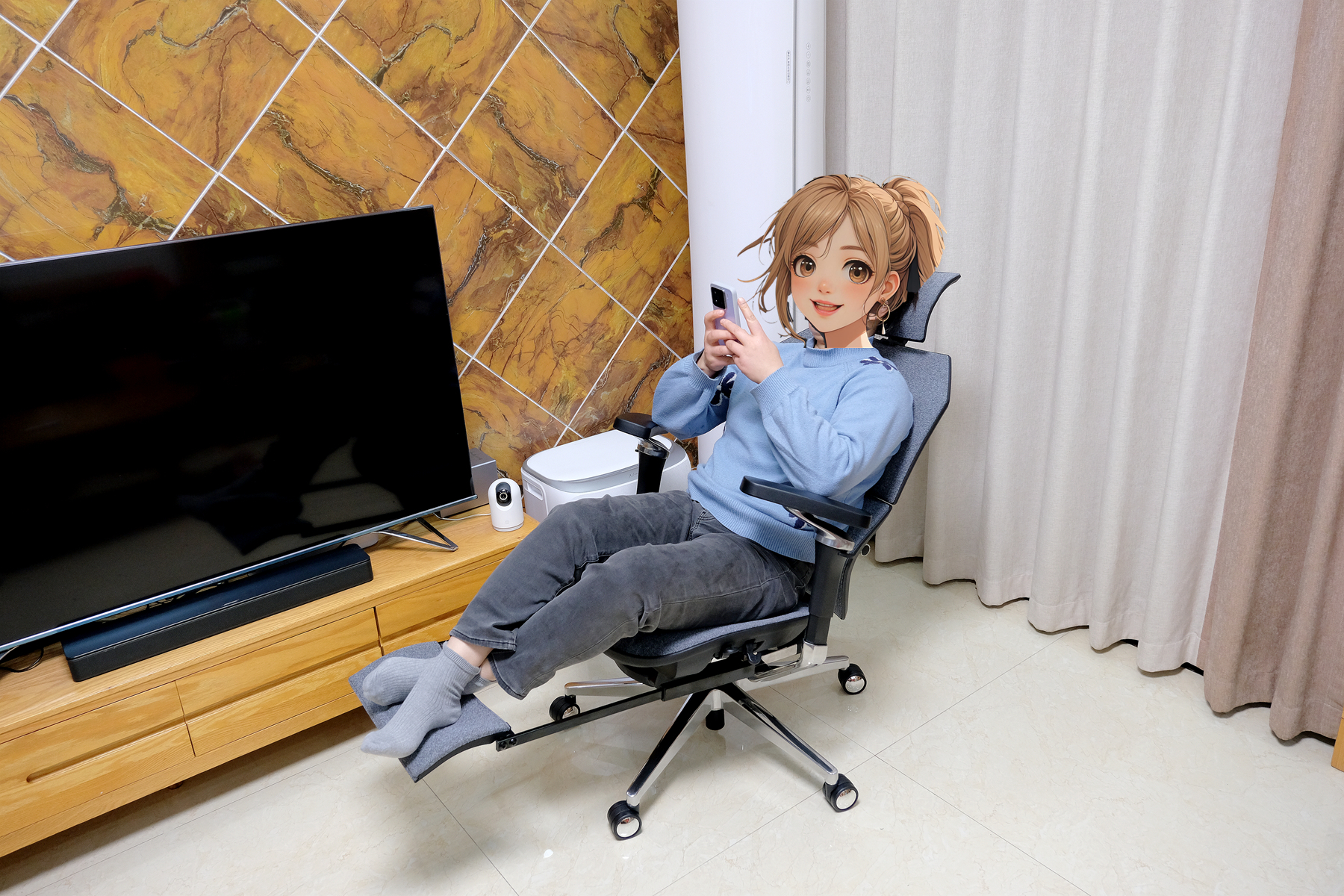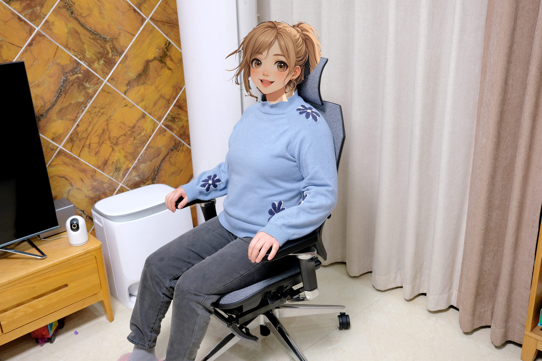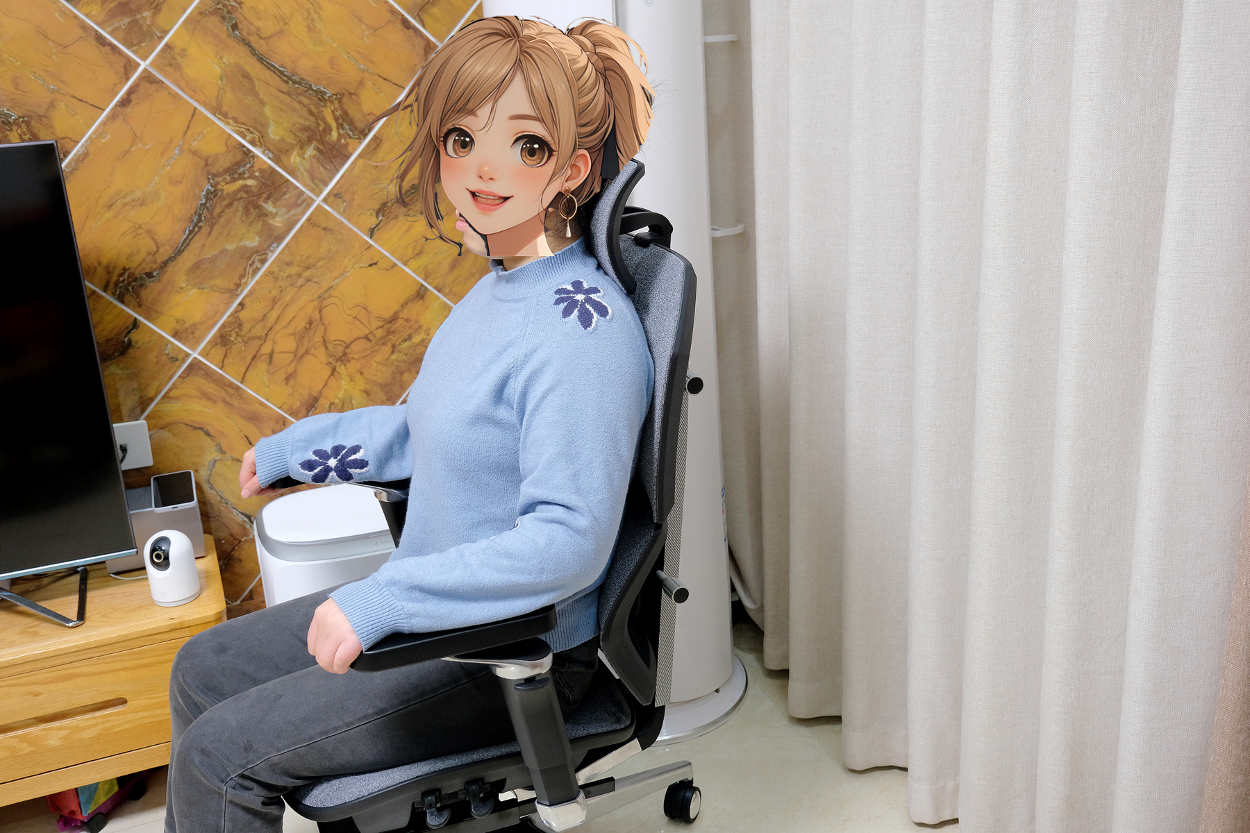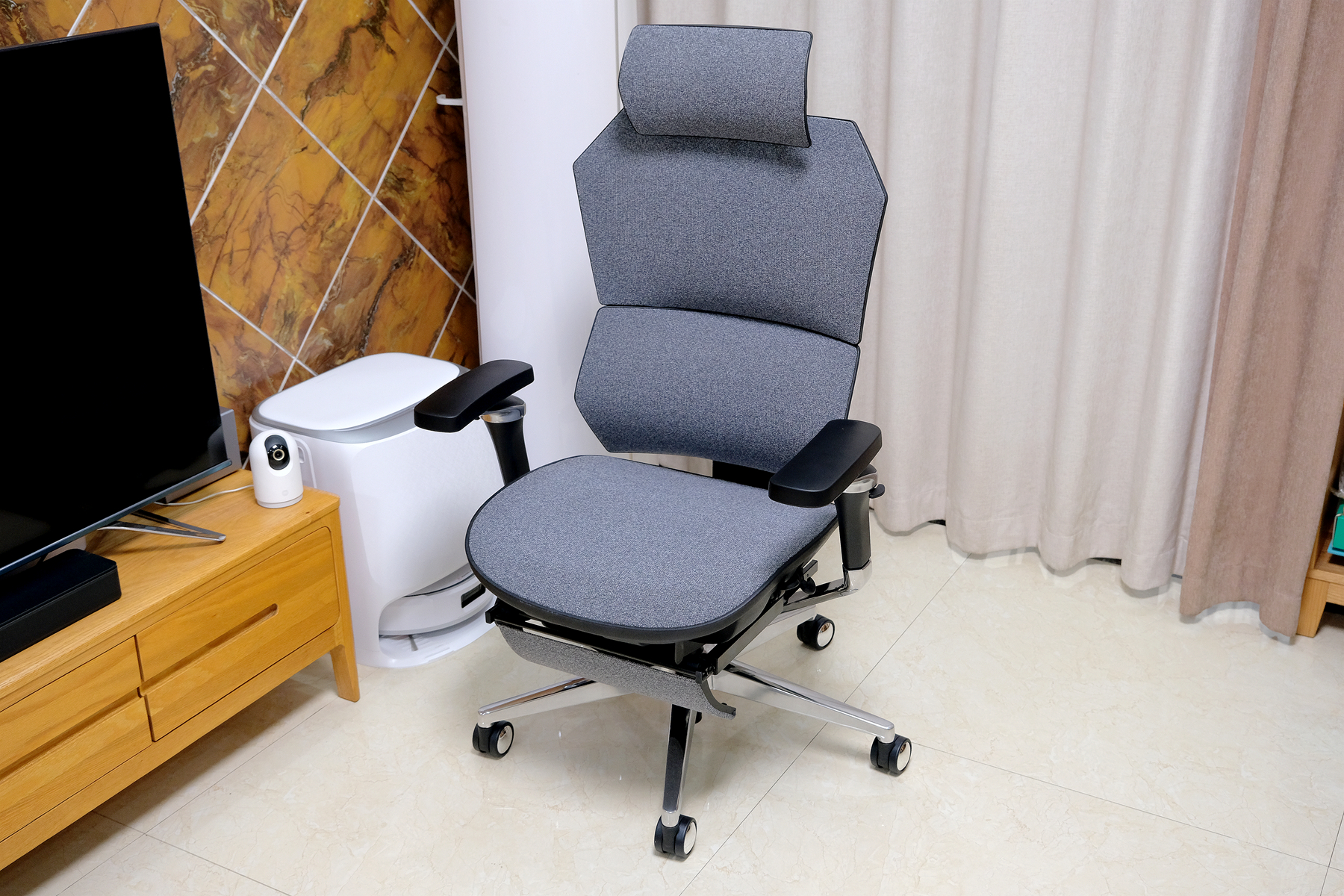 在用模块增加了6cm高度后,坐上去手部没有了落空的感受,支撑也更到位,再将头枕和椅背的高度调节好之后你会感受到整个椅身对身体的支撑都非常到位,特别是这款椅子的骶位支撑效果特别好,不会压迫腰曲,对腰部的支撑很到位,贴合度非常棒,颈、腰、臀这几个部位瞬间就感觉放松了不少,相比之前用的老款椅子舒适度方面那是质的提升▼