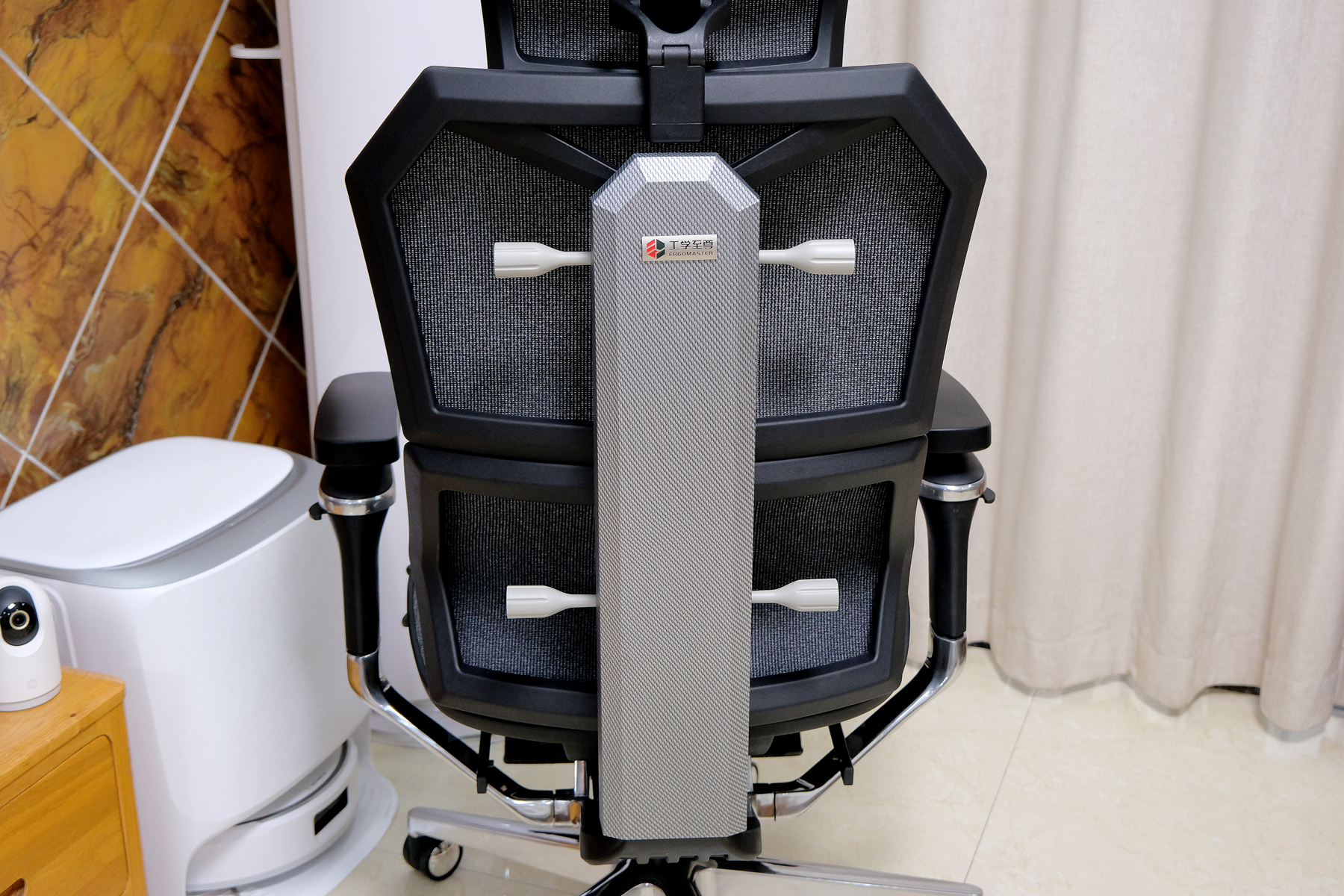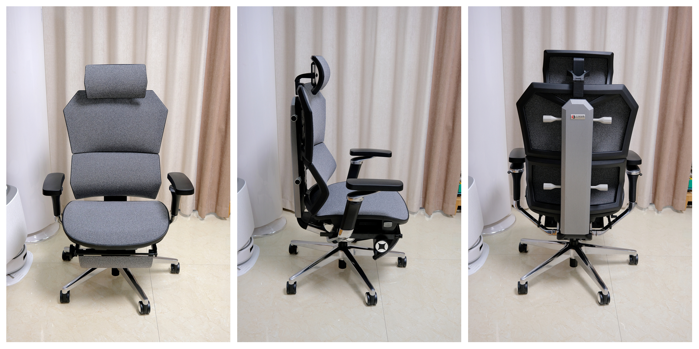 从椅身的背面可以看出是一体成型的框架工艺结构,更为稳固的同时也更耐用,中间部分是类碳纤维的装饰背板,上方可以看到“工学至尊”的标识贴牌▼