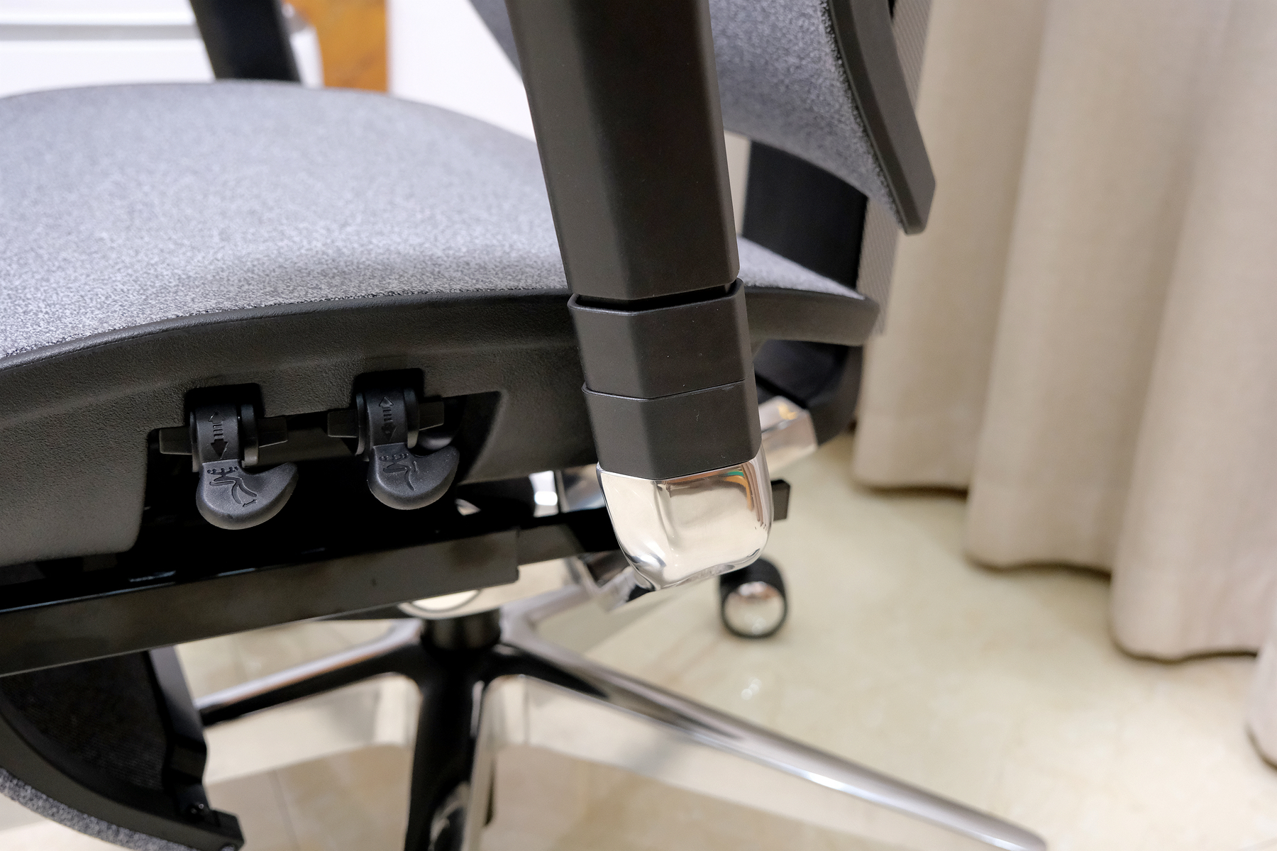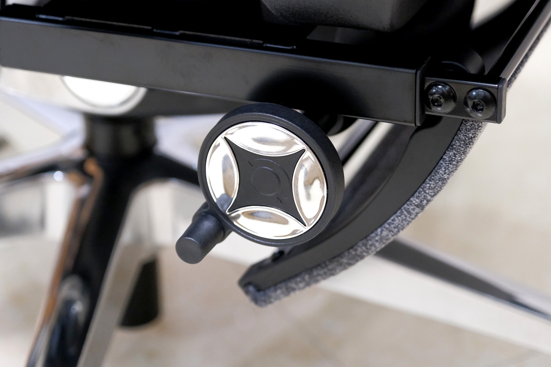 坐垫的右侧靠上的按钮是是坐深的前后调节,其下方的转轮通过正反转到调节椅背回弹松紧度,用户可以根据自身的体重来进行调节,从而让身体达到完美的椅背后仰力量的适应性▼