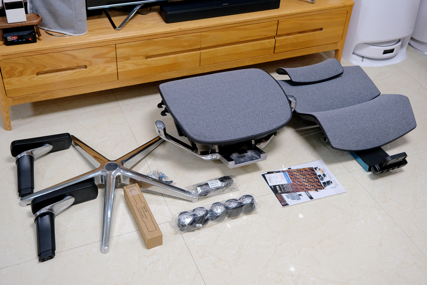 拆开纸箱包装后将工学椅的配件全部取出,包括了椅背、底座、铝合金五星脚、静音椅轮、气压棒、多功能扶手、螺丝工具及纸质说明书等,查看了下配件没有任何磕碰和磨损▼